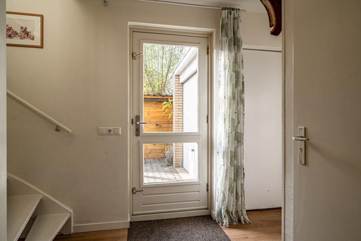 • Entree met hal, meterkast, modern toilet, trapopgang en deuren naar garage en woonkamer.