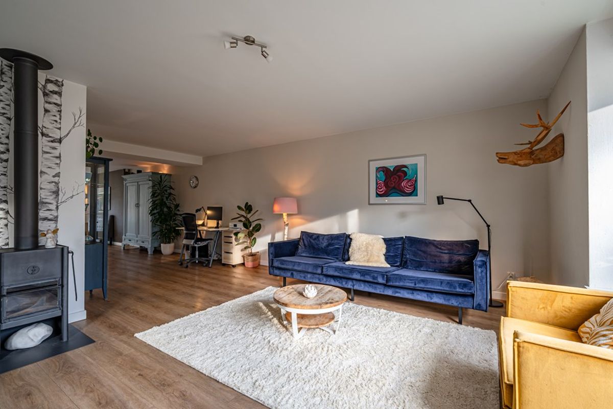 • Zeer ruime L-vormige woonkamer met erker, lichte PVC-vloer met vloerverwarming en een rookkanaal (houtkachel blijft niet achter).
