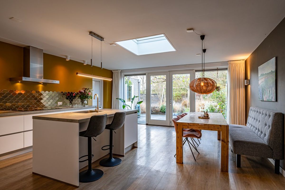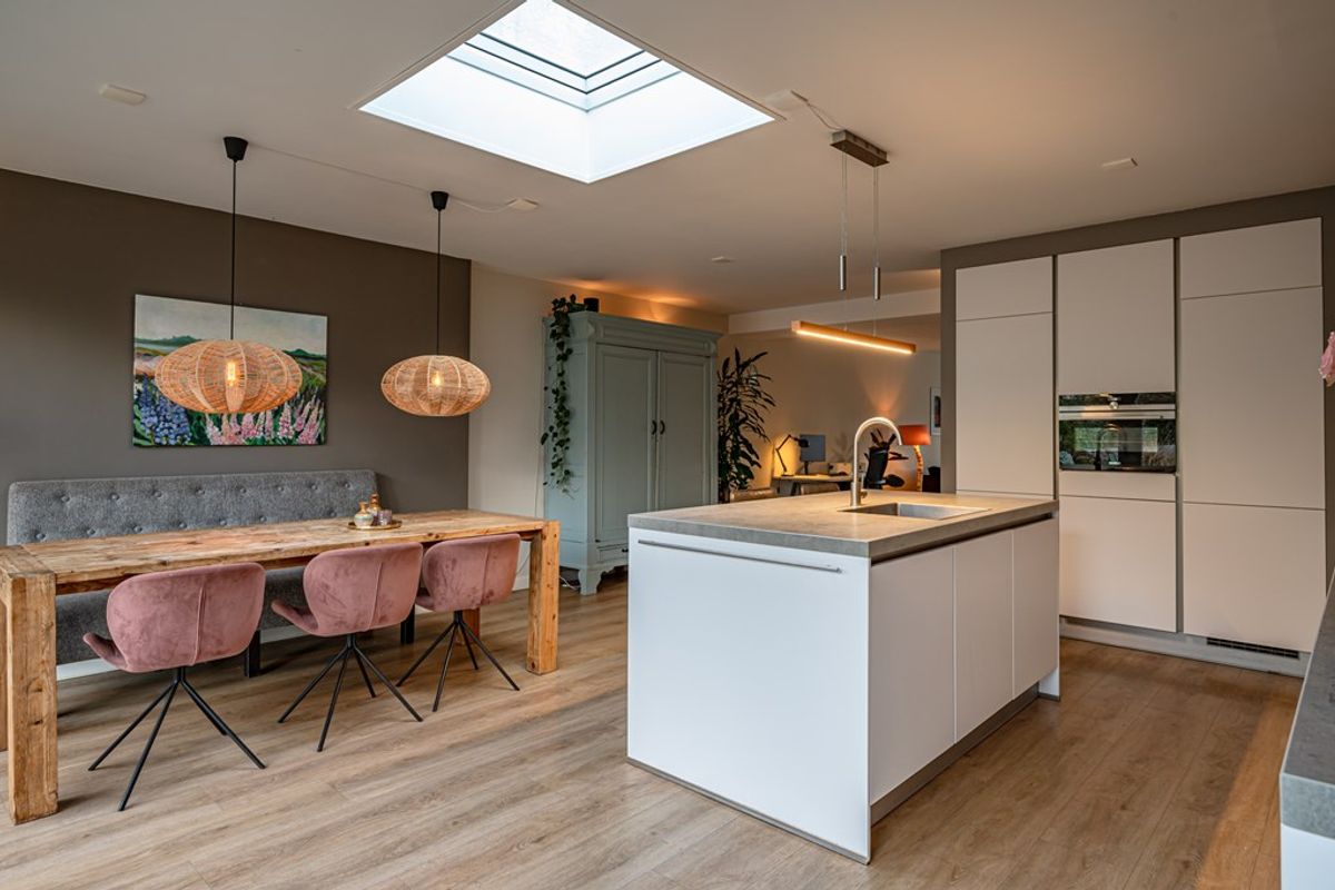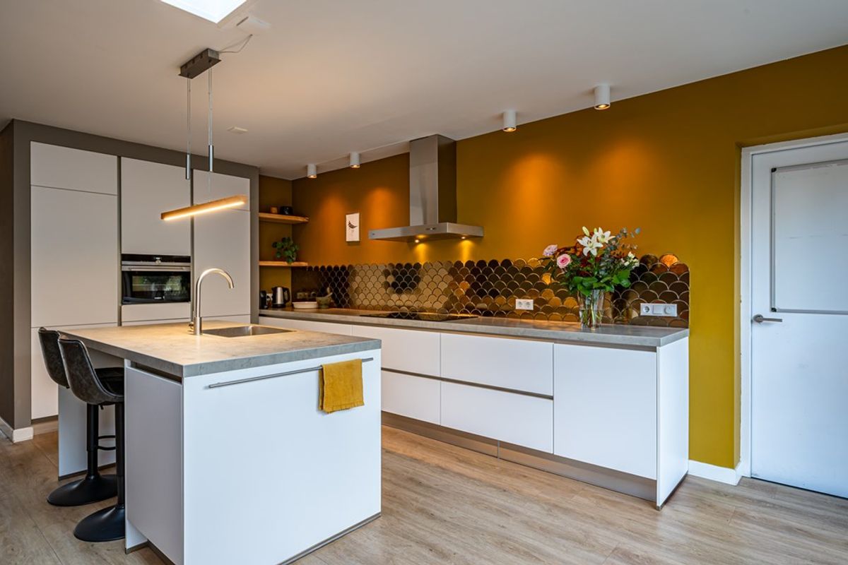 • Luxe uitgebouwde woonkeuken met keukenkeiland, lichtkoepel, vloerverwarming en openslaande tuindeuren. Voorzien van moderne inbouwapparatuur: koelkast, oven, vaatwasser, 5-pits inductiekookplaat en rvs-afzuigkap.