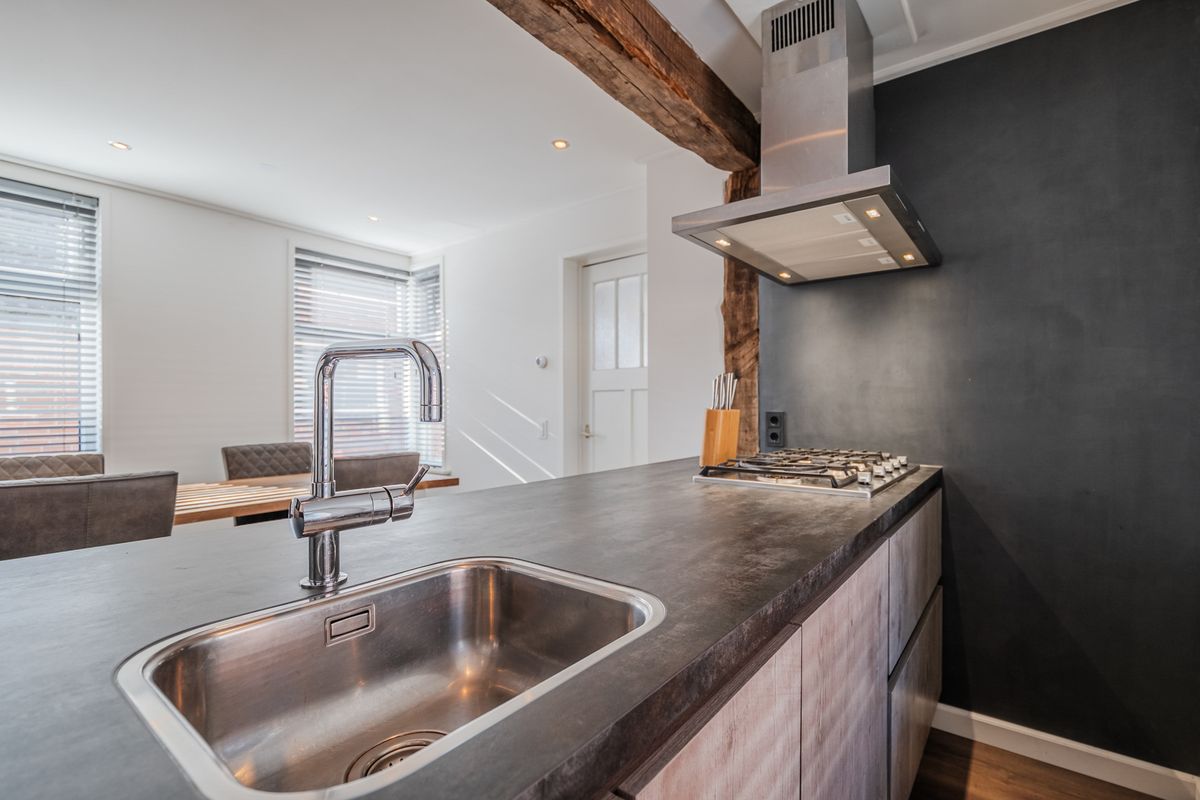- Ruime Woonkeuken voorzien van inbouwkeuken met diverse inbouwapparatuur; combimagnetron, koelkast, 5-pits gaskookplaat, RVS afzuigkap en vaatwasser.