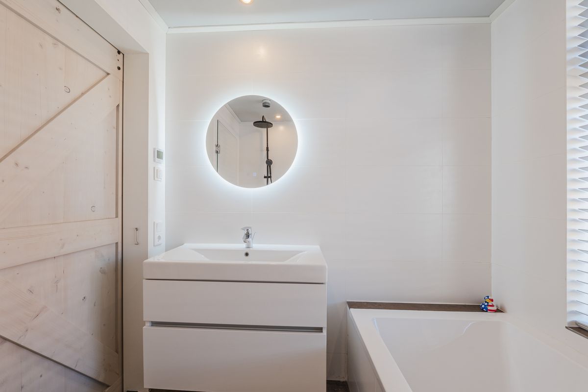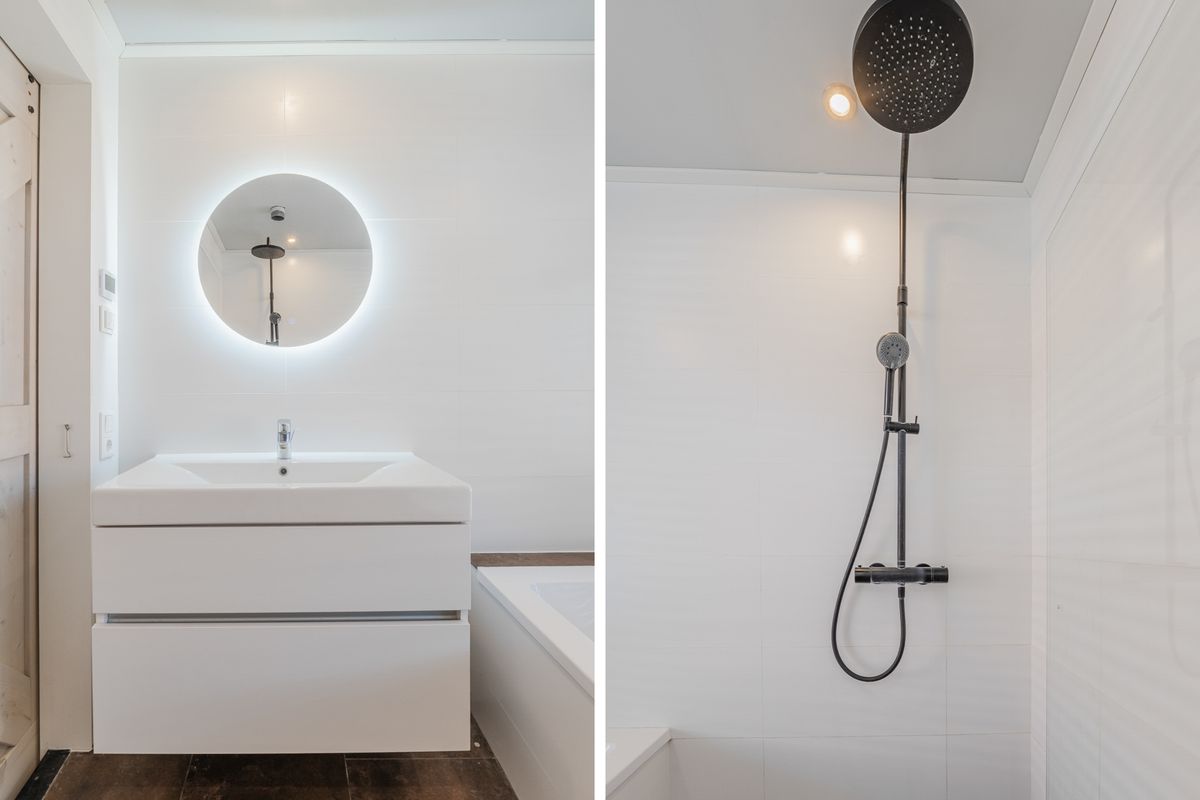 - Badkamer met ligbad, wastafelmeubel, douchehoek en verwarmd middels elektrische vloerverwarming