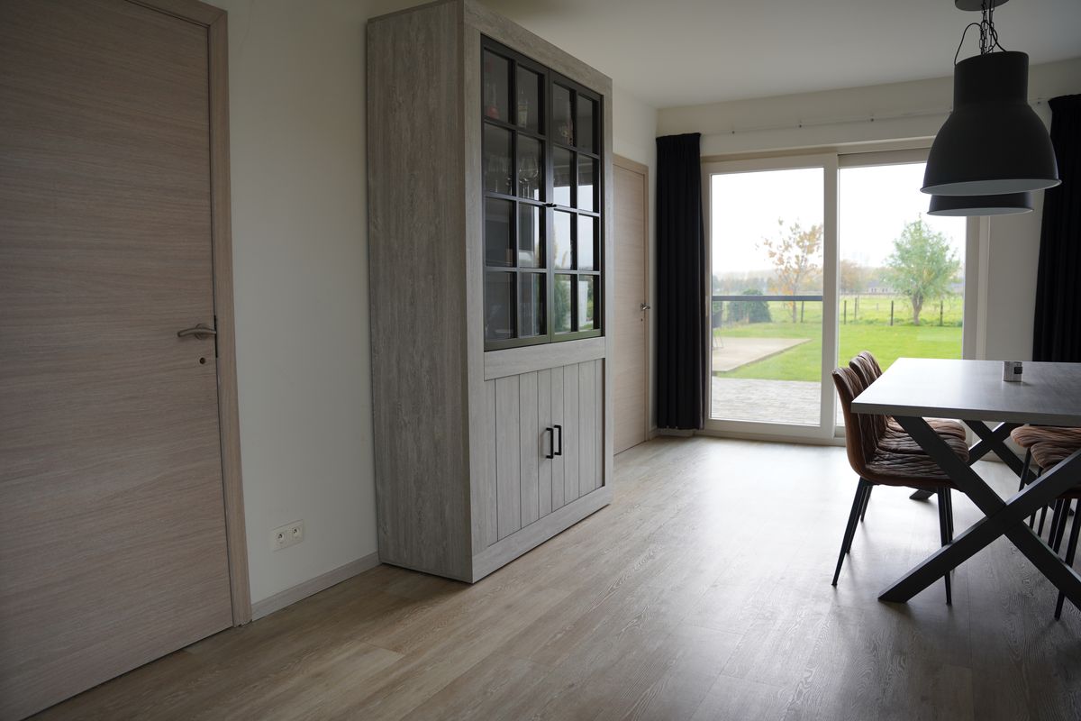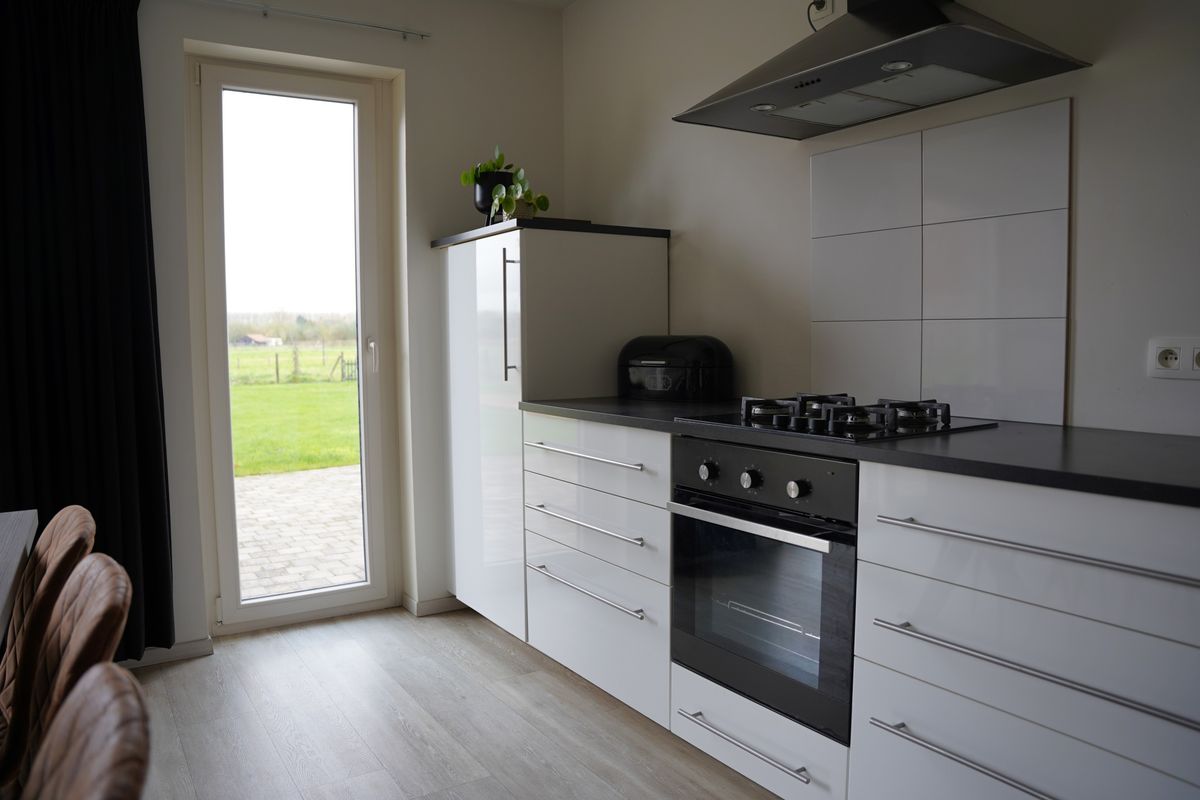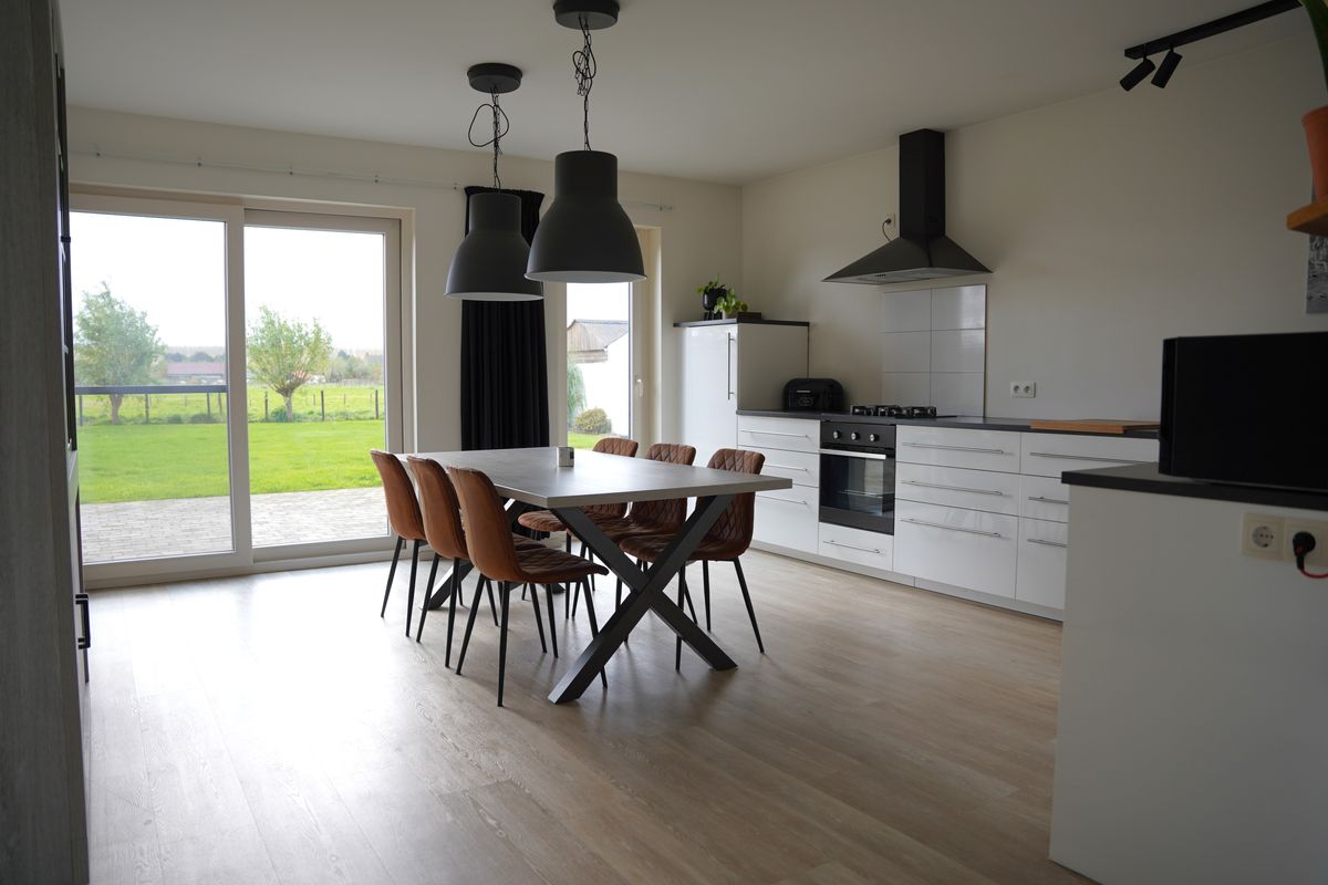 De open woonkeuken vormt het hart van het huis en is volledig uitgerust met alle benodigde inbouwapparatuur. Vanuit de keuken kijk je – dankzij de royale schuifpui - uit over de tuin en de achterliggende weilanden. Een uitzicht wat nooit verveelt.