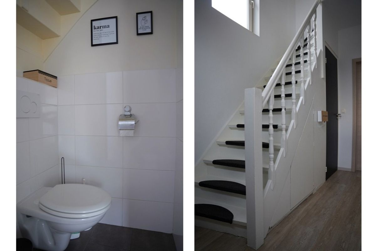Je komt binnen in een royale hal met statige trappartij, toilet en de meterkast.
