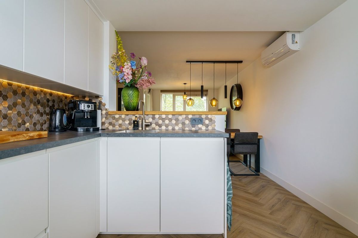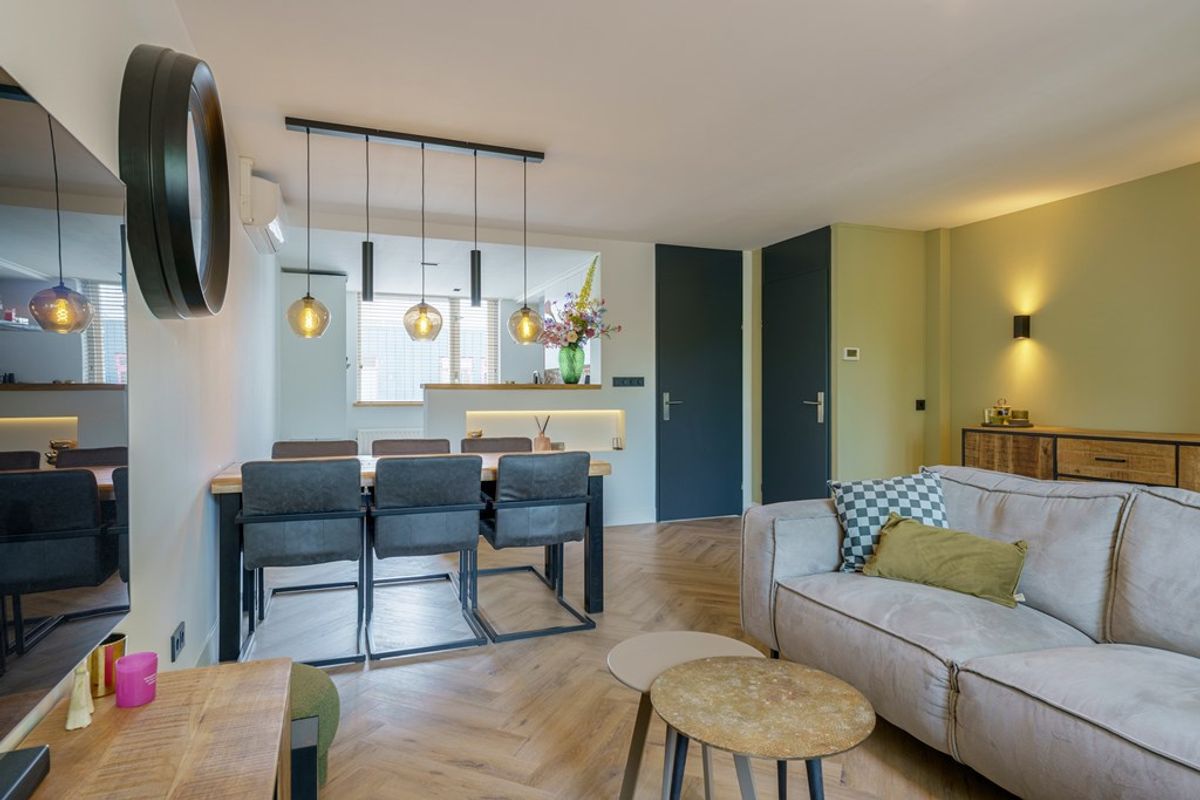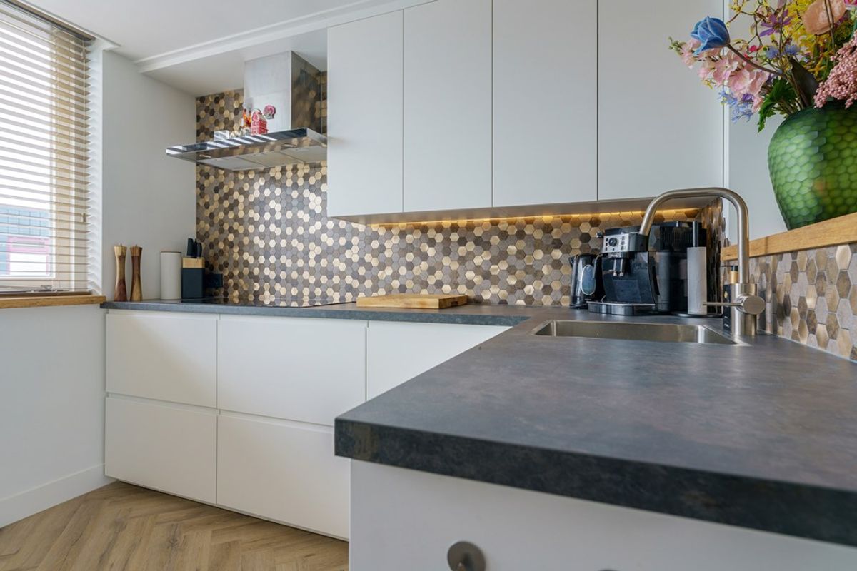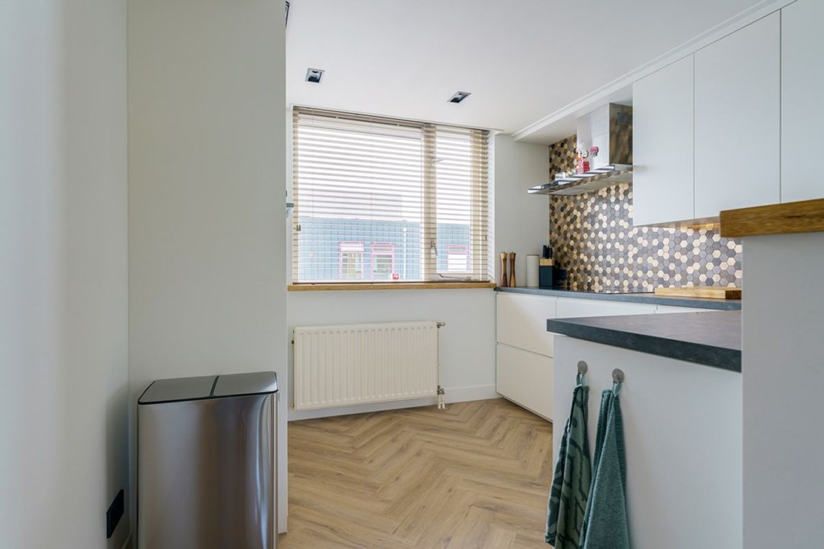 De living is verrassend licht dankzij ramen aan twee zijden, met een strakke PVC vloer in visgraatmotief en toegang tot het balkon. De halfopen keuken in rechte opstelling is uitgevoerd met greeploze fronten, een donker werkblad, een stijlvolle hexagon-mozaïek achterwand en diverse inbouwapparaten. De woonkamer biedt ruimte voor een royale zit- en eethoek en is keurig afgewerkt. Op de tweede verdieping geeft de overloop toegang tot drie ruime slaapkamers, waarvan één zich leent als inloopkast of werkplek.