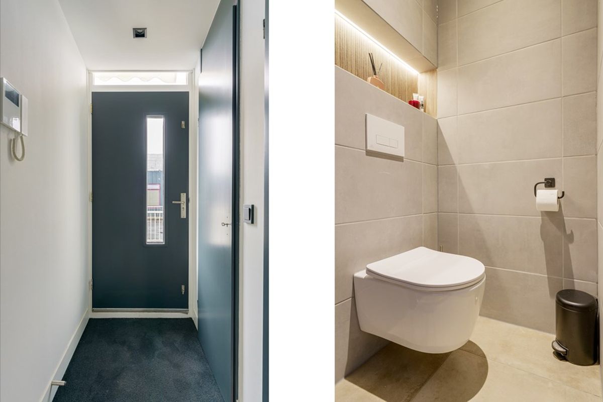 Op de begane grond kom je binnen in de centrale entree met intercom, brievenbussen, trappenhuis en lift. Het complex oogt verzorgd en kleinschalig; via de lift of trap bereik je de eerste verdieping. Aan het einde van de brede galerij tref je de voordeur van de woning. Direct naast de voordeur ligt het zonnige, op het westen gelegen terras en de berging; via de entree met meterkast en toiletruimte loop je door naar de woonkamer.