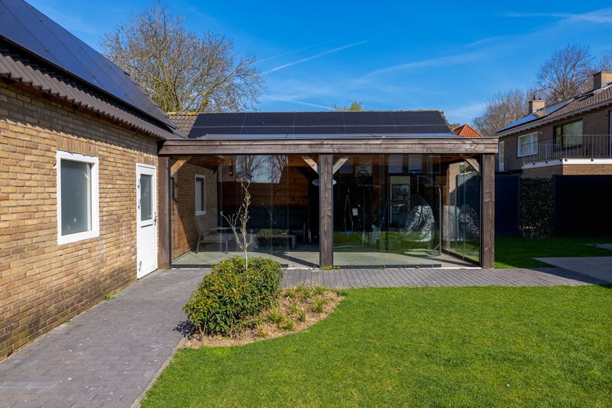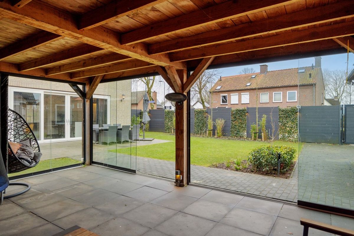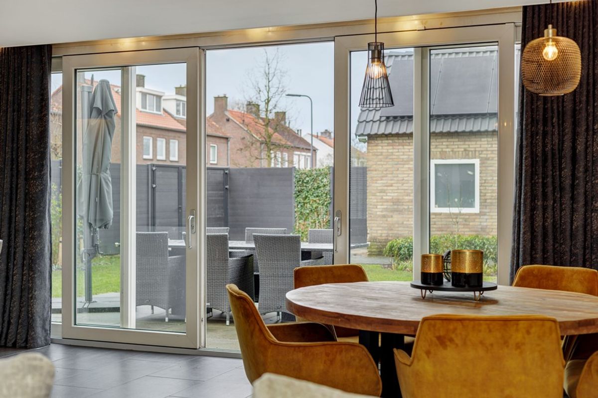 Via de dubbele schuifdeuren loopt u zo de zonnige tuin in, met een overdekte veranda die uitnodigt tot lange avonden buiten, in alle seizoenen.