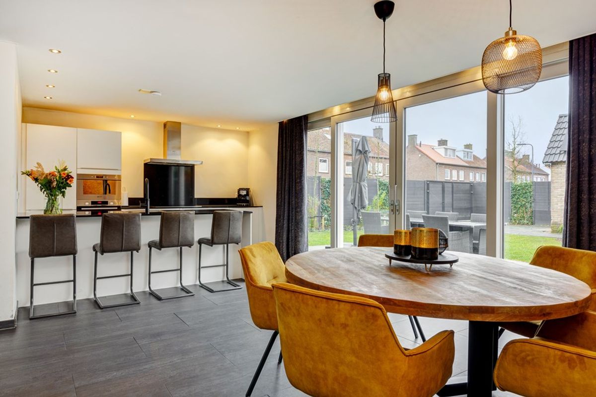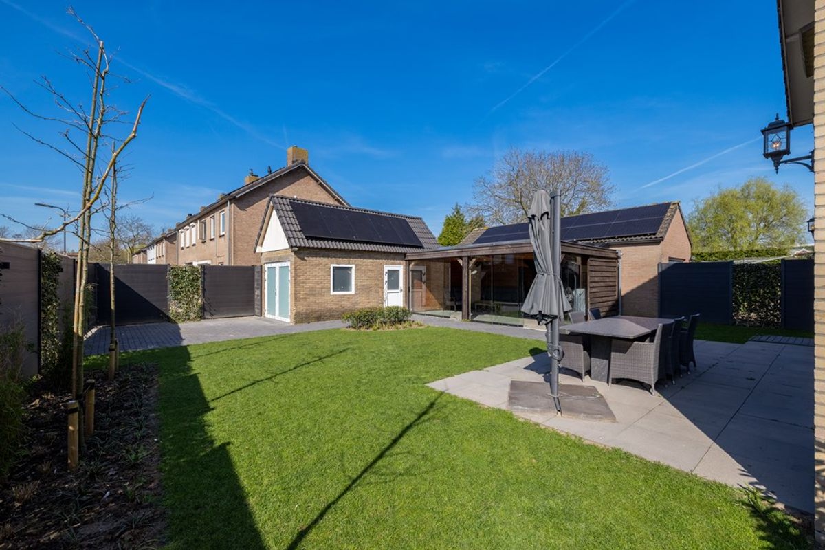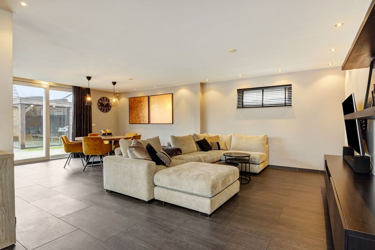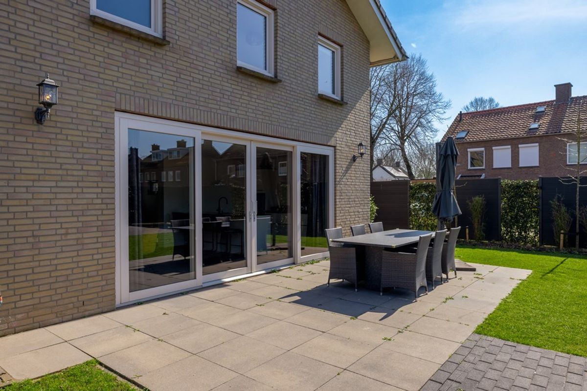 Via de dubbele schuifdeuren loopt u zo de zonnige tuin in, met een overdekte veranda die uitnodigt tot lange avonden buiten, in alle seizoenen.