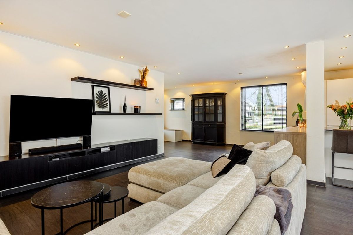 De lichte woonkamer biedt dankzij de grote raampartijen een weids uitzicht op het aangrenzende park en is ingericht met een sfeervolle zithoek. Deze ruimte wordt gecompleteerd door een royale, multifunctionele kamer ideaal als speelkamer, hobbyruimte of thuiskantoor, geheel naar eigen wens in te richten.