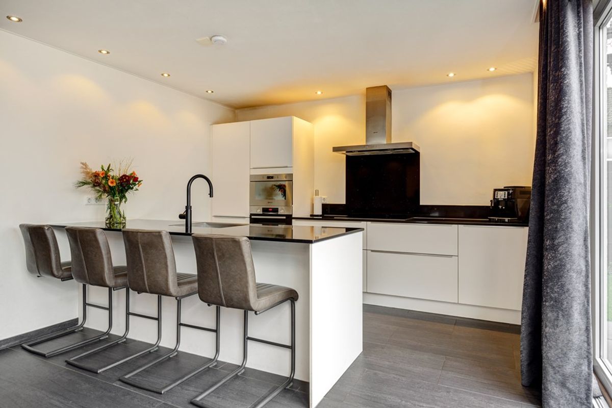 Centraal in de woning bevindt zich de luxueuze leefkeuken met royaal kookeiland, hoogwaardige inbouwapparatuur (waaronder combi-ovens, inductiekookplaat en Quooker) en overvloedige bergruimte. Het is een plek waar koken, tafelen en samenzijn op natuurlijke wijze samenkomen.