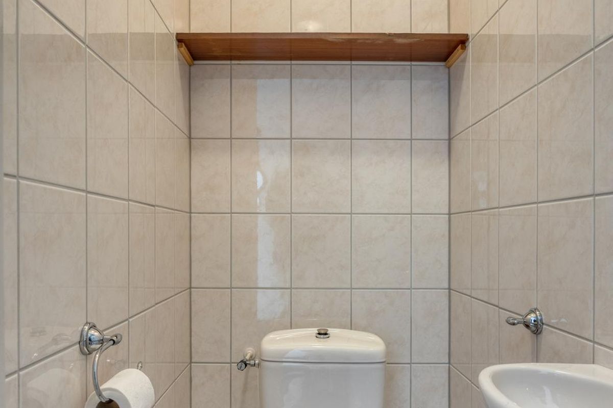 Toilet, welke aan wanden en vloer geheel licht betegeld is, is v.v. closet, fonteintje en mechanische ventilatie (met hier ook de standen-bedieningsknop ervan).