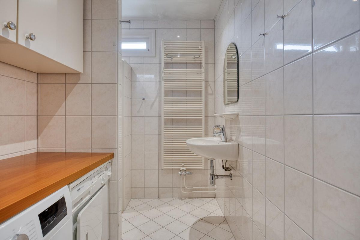 Doucheruimte, welke idem als toilet betegeld is, is v.v. douchecabine met thermokraan, wastafel met mengkraan, designradiator met daarboven een kunststof plafondafwerking met spotverlichting en mechanische ventilatie. Tevens zijn hier de witgoed aansluitingen met daarboven handige bovenkasten en een werkblad.