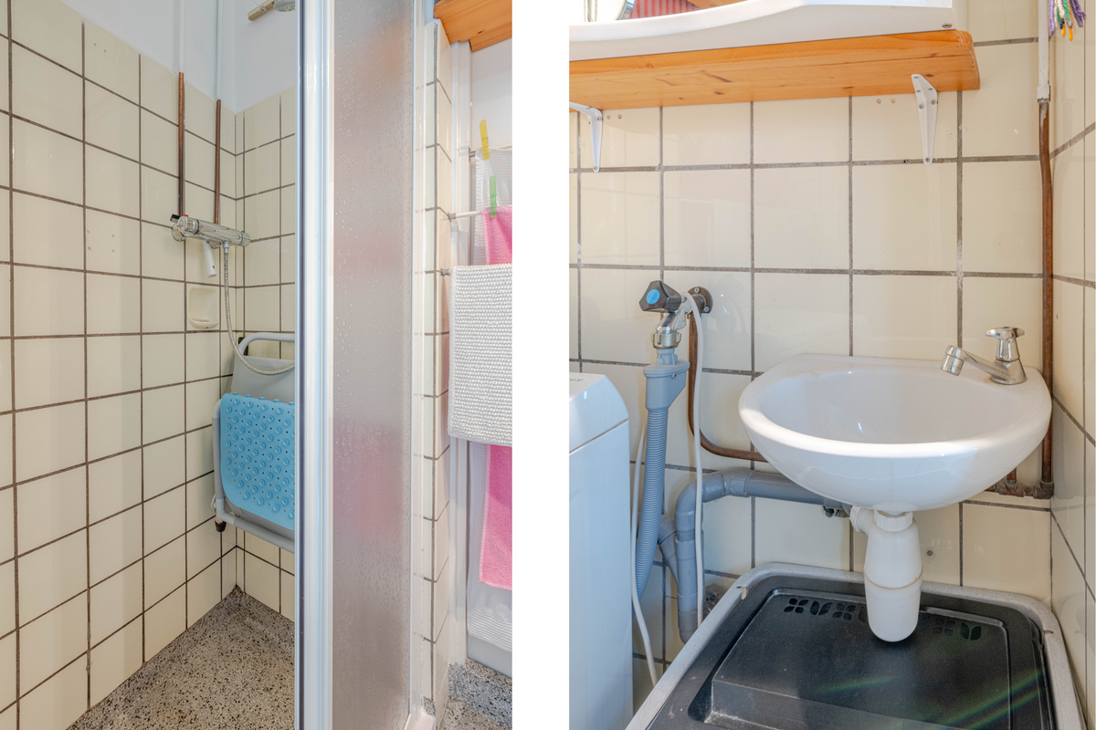 * Badkamer voorzien van douche, wastafel, aansluiting voor de wasmachine en gedeeltelijk betegelde wanden.