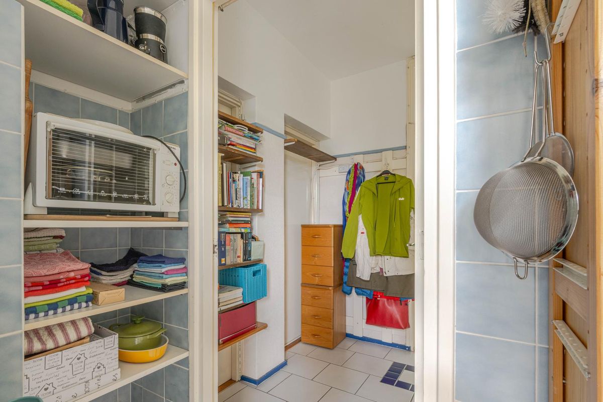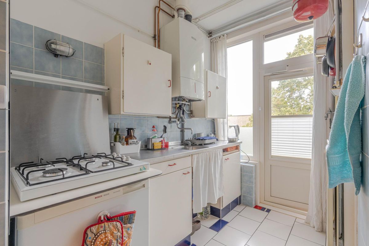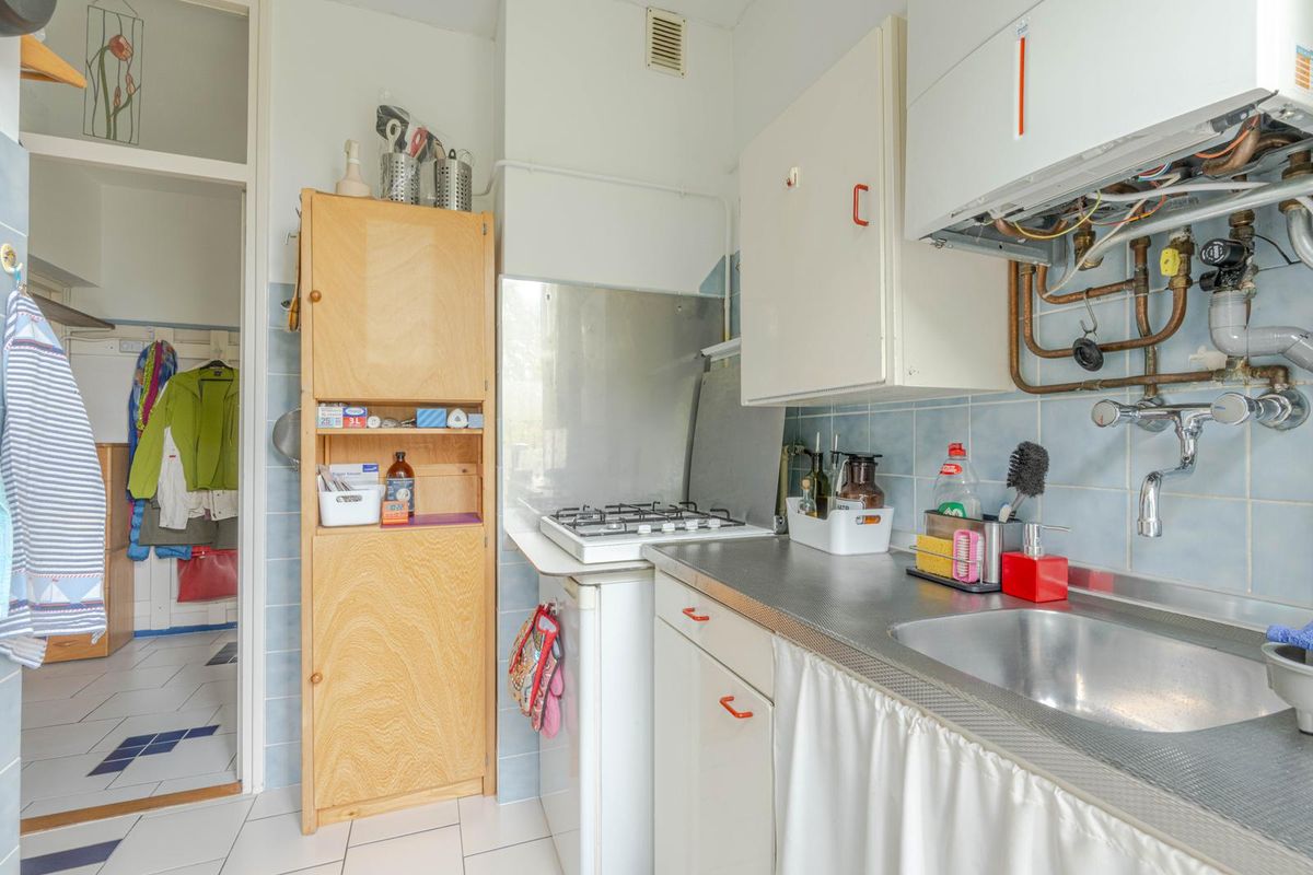 * Keukenruimte voorzien van tegelvloer, gedeeltelijk betegelde wanden, functionele keukenopstelling met RVS werkblad, spoelbak, opstelling van de C.V.-combiketel, eveneens toegang tot de badkamer en een deur naar het balkon aan de achterzijde.