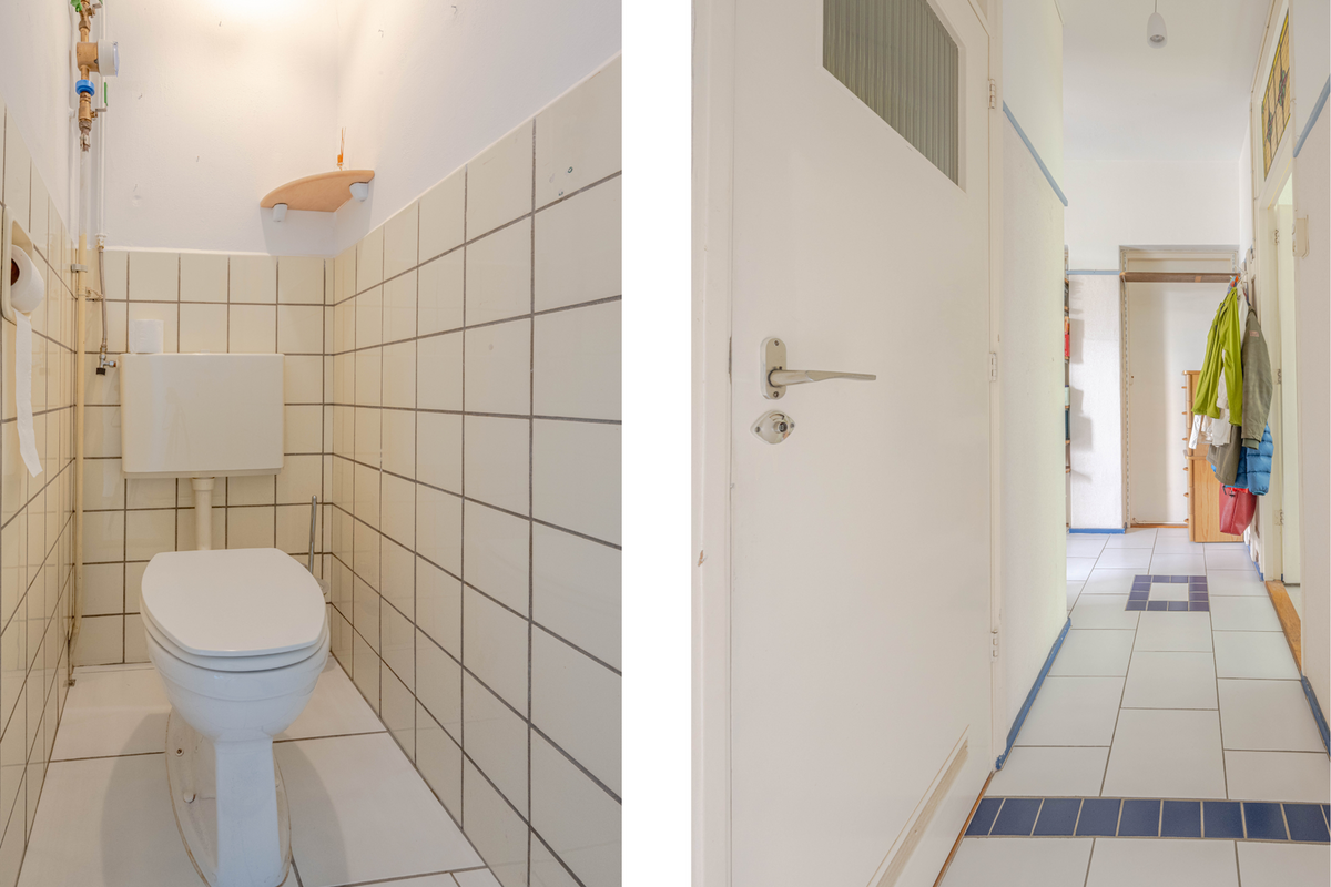 * Toiletruimte voorzien tegelvloer, half betegelde wanden en duoblok-toiletopstelling.