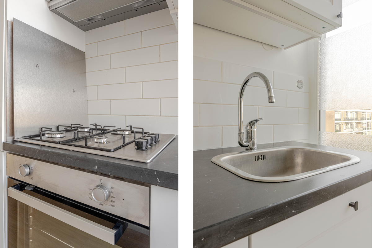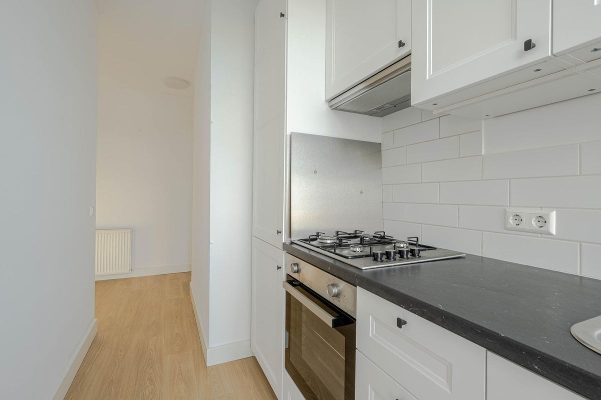* Keukenruimte voorzien van laminaatvloer, gedeeltelijk betegelde achterwand, nieuwe inbouwkeuken (2025) met inbouwapparatuur: gaskookplaat, afzuigkap, oven en koel-vriescombinatie. Deur naar het balkon aan de achterzijde.