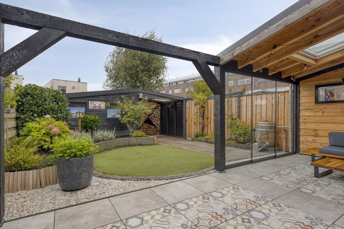 Achtertuin: De achtertuin heeft een lengte van 11 meter en een breedte van 6,78 meter. Direct grenzend aan de woning is dit jaar een overkapping (2,92 x 6,78 m) geplaatst, waarvan de helft open is. In de zomer kan hier een doek worden gespannen, terwijl het dichte deel is voorzien van een Velux-dakraam. Achter in de tuin staat een grote houten berging (3,93 x 3,41 m) met daarnaast een overkapping voor houtopslag en een plek om de was te drogen. Aan de zijkant bevindt zich een schuifpoort, waar ook de mogelijkheid is om elektrisch te laden.
