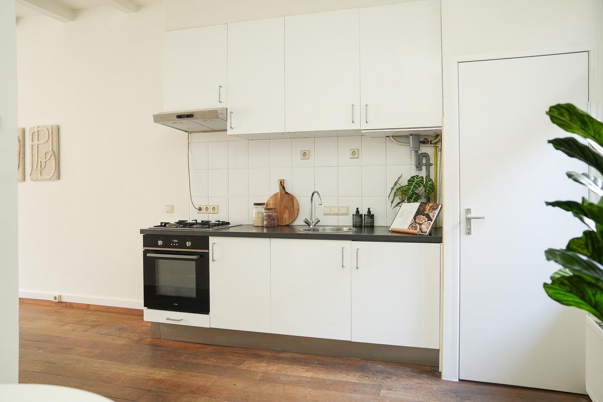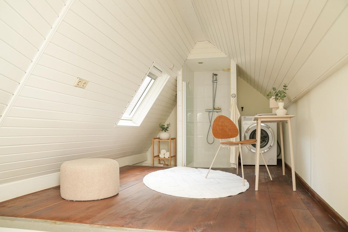 1e verdieping: Entree, sfeervolle woonkamer aan de voorzijde gelegen met o.a. fraai balkenplafond en massief houten vloer. De open keuken staat in directe verbinding met de woonkamer, is in rechte opstelling gesitueerd en heeft de beschikking over enige inbouwapparatuur. Toilet met fonteintje, doorgang naar ruime badkamer met douche, werk vide, en aansluiting wasmachine. Trap naar slaapkamer van circa 10 m2 completeert het geheel.