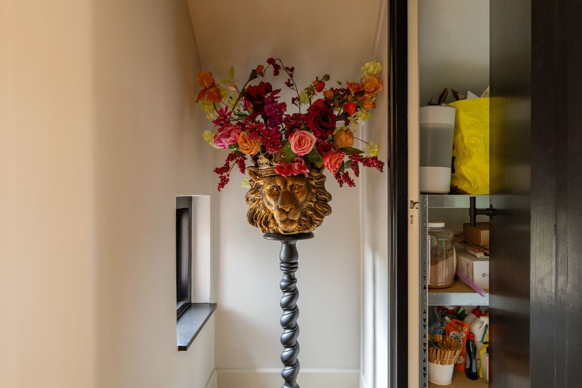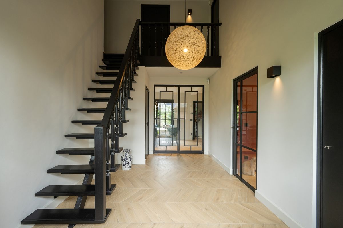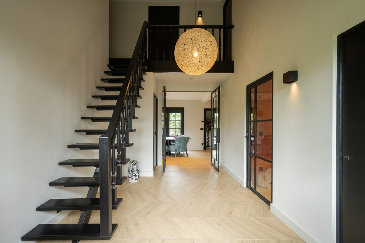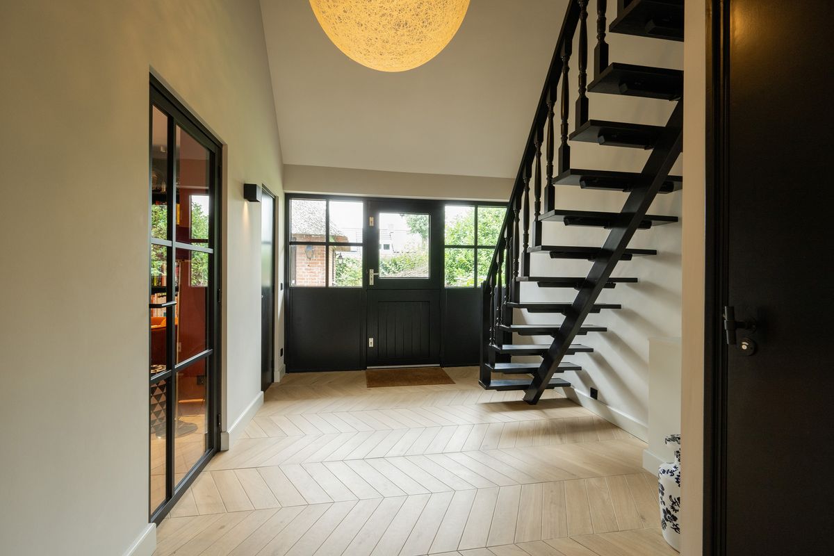 Via de royale hal met vide stap je binnen in deze lichte en sfeervolle woning. De hal biedt toegang tot het toilet, de woonkamer, de keuken en de werkkamer.