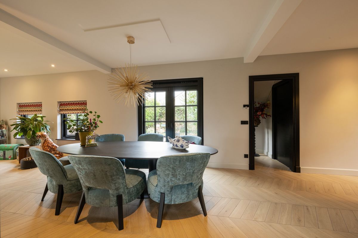 De woonkamer is royaal, licht en sfeervol met veel glas en dubbele deuren. De zithoek is intiem met de gashaard en het zicht op de tuin en de achtergelegen landerijen (waar je soms zelfs herten kunt zien lopen). Aan de westkant vind je de eethoek met openslaande deuren naar het terras met de oude klinkertjes.