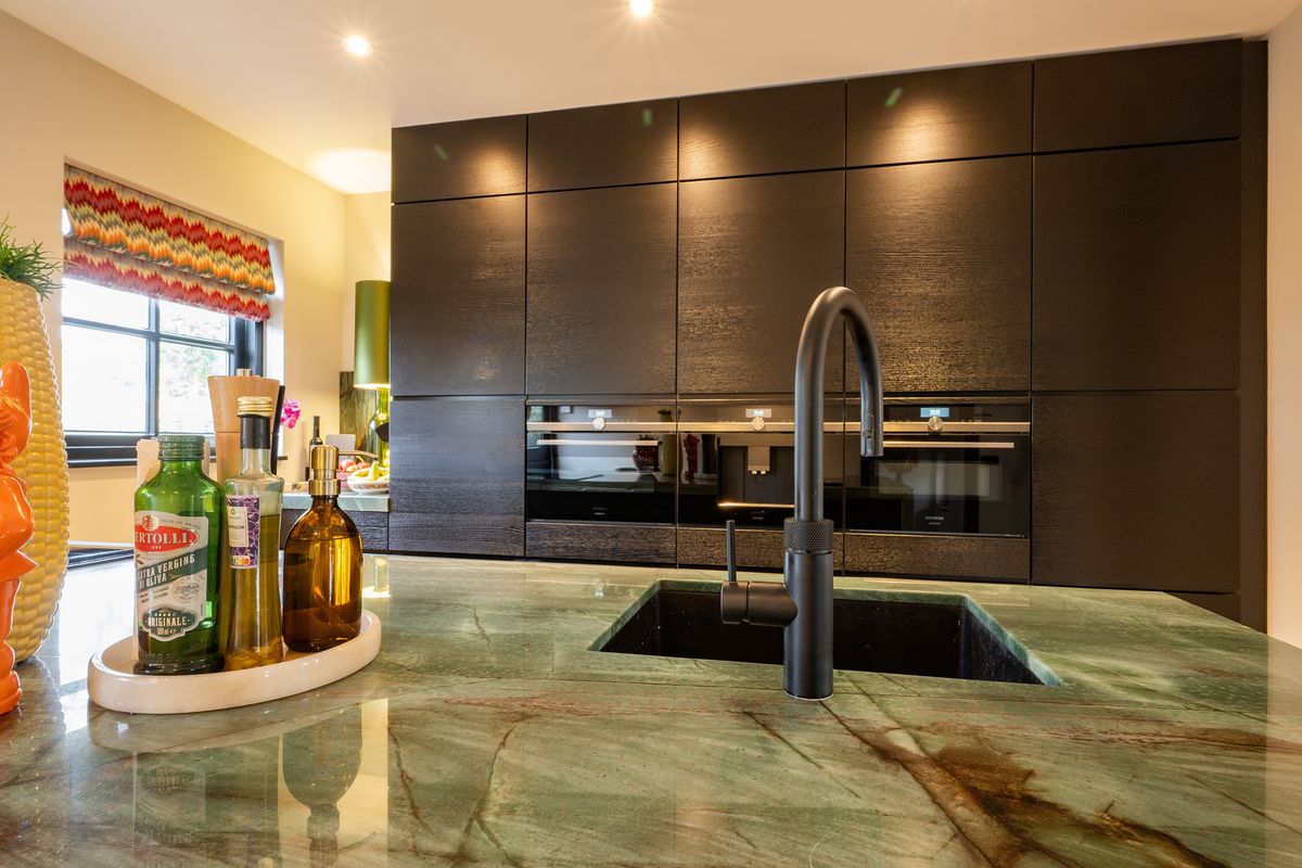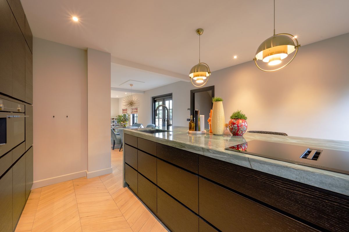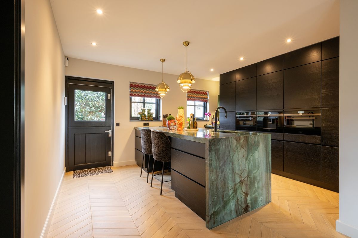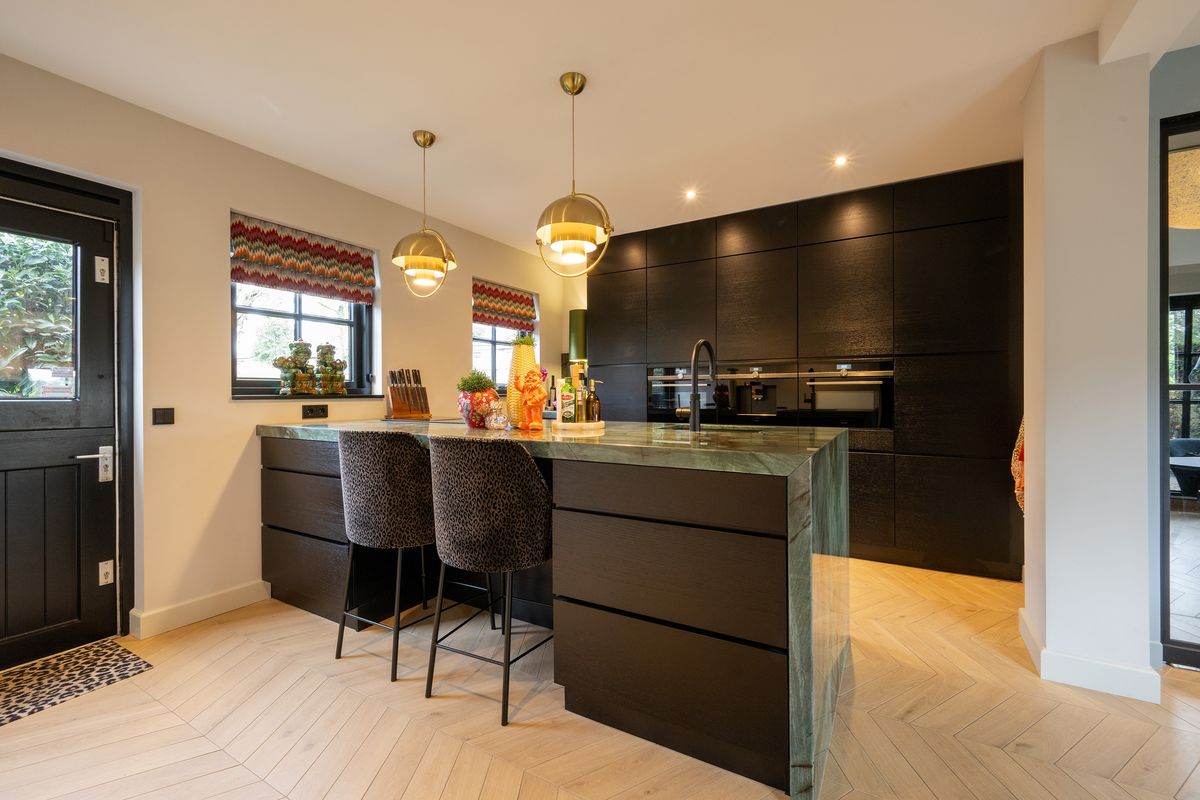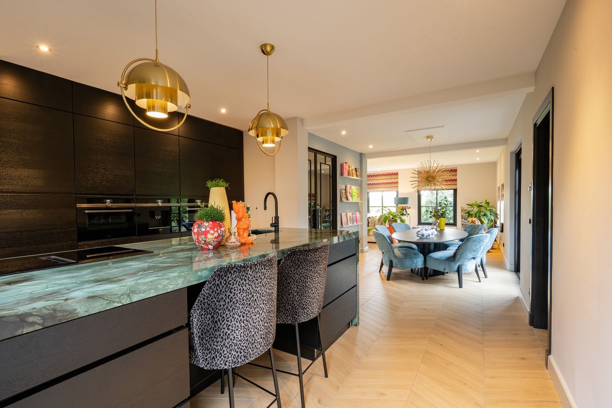 De keuken (2022) is luxe, modern en heeft een groot kook- spoeleiland, uitgevoerd in kwartsiet. We treffen er hoogwaardige inbouwapparatuur aan, zoals koelkast, vriezer, inductiekookplaat met geïntegreerde afzuiging, Quooker met gekoeld en bruisend water functie, oven, stoomoven en een koffiemachine. Vanuit de keuken bereik je de handige kelder - perfect voor opslag van mooie wijnen, voorraad of keukenbenodigdheden. Ook treffen we hier de witgoedaansluitingen aan.