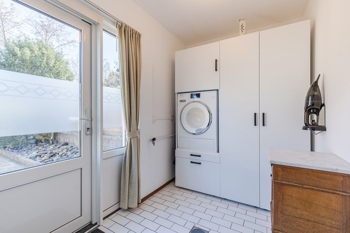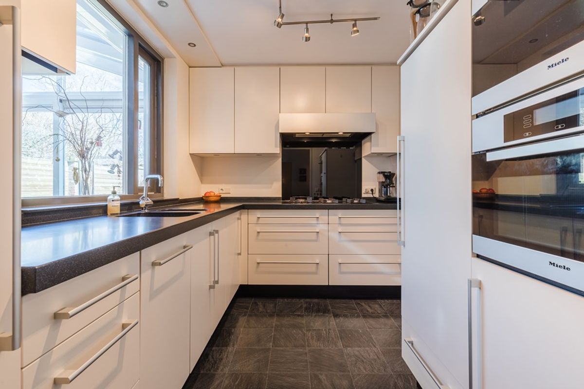Hal (7 m²) met tegelvloer, modern zwevend toilet met fonteintje, royale en sfeervolle L-vormige woonkamer (40 m²) met parket-vloer, aansluitend een serre (11 m²) met tegelvloer en een schuifpui, dichte keuken (7 m²) met een luxe inbouwkeuken v.v. voornamelijk Miele apparatuur, waaronder een 5 pits gaskookplaat, afzuigkap, stoomoven, combi magnetron, koelkast, vaatwasser en een Corian aanrechtblad, praktische bijkeuken (5 m²) met aansluitingen voor witgoed en de inpandige garage (16 m²) met een elektrisch bedienbare garagepoort.