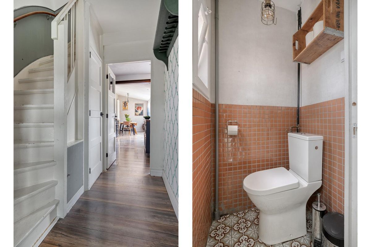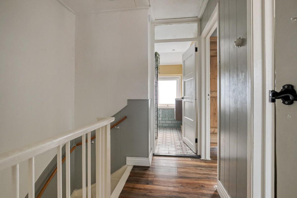 Vanaf de overloop bereik je twee ruime slaapkamers. De voormalige badkamer is nu in gebruik als praktische was- en bergruimte. De tweede, kleinere kamer aan de achterzijde is omgetoverd tot moderne badkamer, voorzien van een inloopdouche, toilet en wastafel.