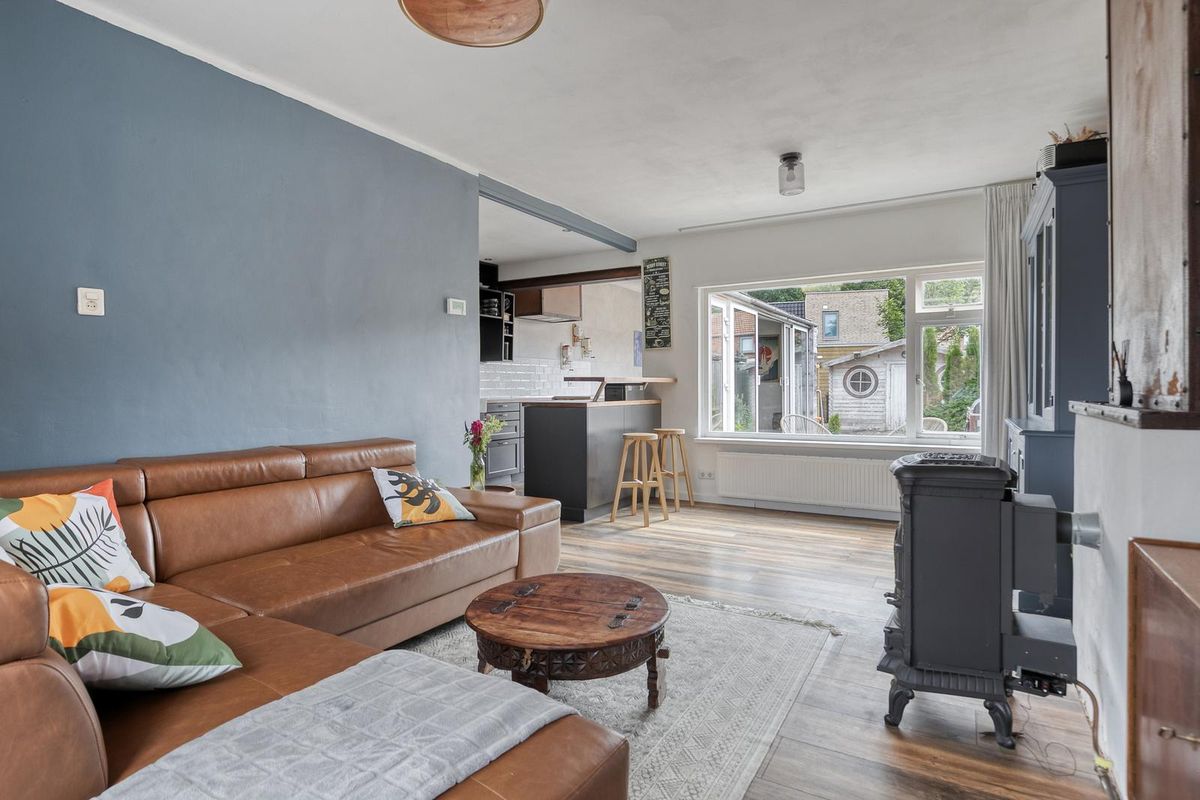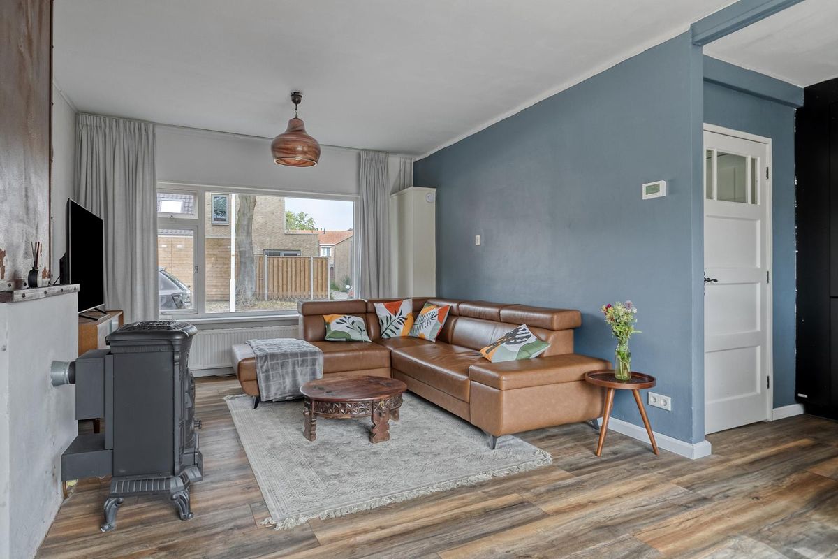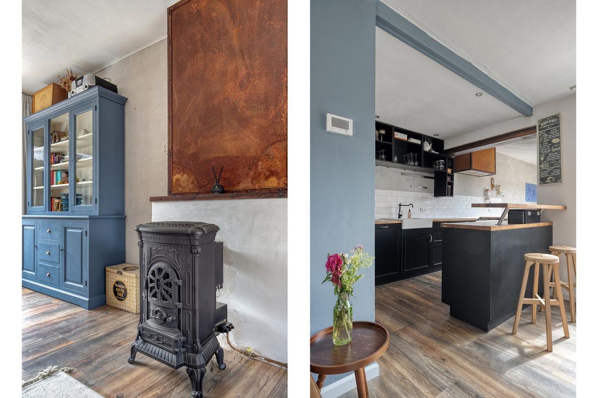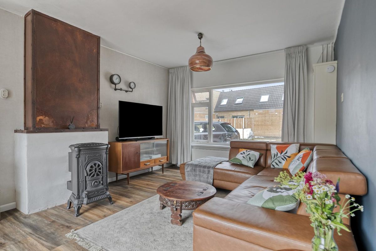 Tegenover de keuken bevindt zich de lichte woonkamer. Dankzij de grote ramen valt er veel daglicht binnen en de sfeervolle gashaard zorgt voor warmte en gezelligheid tijdens koude winteravonden.