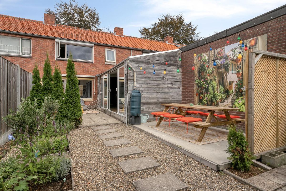 De onderhoudsvriendelijke achtertuin is een fijne plek om te genieten van het buitenleven. Achterin de tuin staat een houten vrijstaande berging, ideaal voor fietsen of tuinmeubilair.