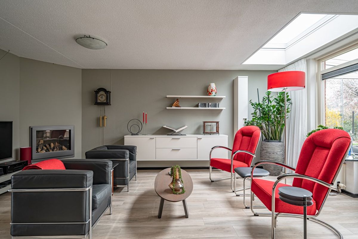 De uitgebouwde woonkamer is een heerlijke leefruimte met veel lichtinval en een sfeervolle gashaard. De lichtstraat (ca. 2025) met elektrisch zonnescherm zorgt voor extra daglicht. Via openslaande tuindeuren bereikt u de serre.