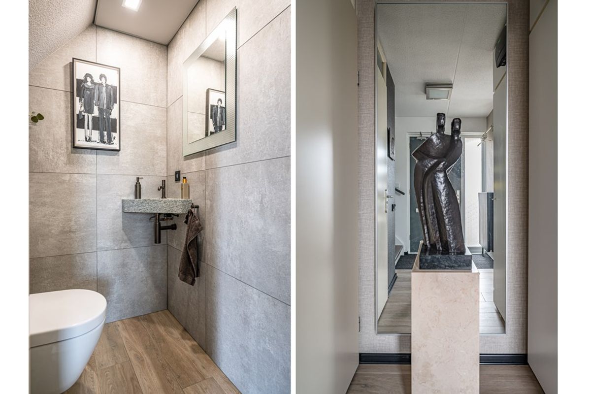 Overdekte entree met inbouwspots. Hal met meterkast, trapopgang (bekleed met pvc) en een luxe toiletruimte voorzien van een hangend toilet en natuurstenen wastafel.