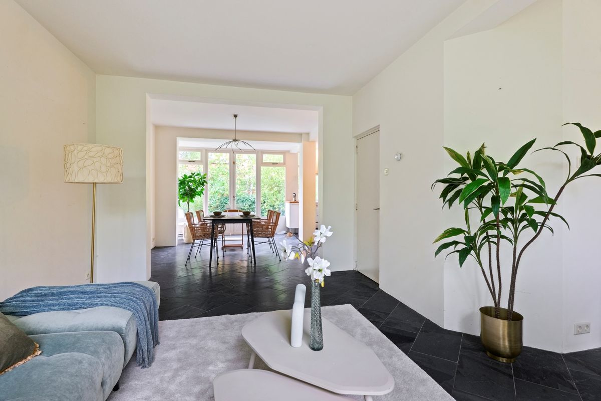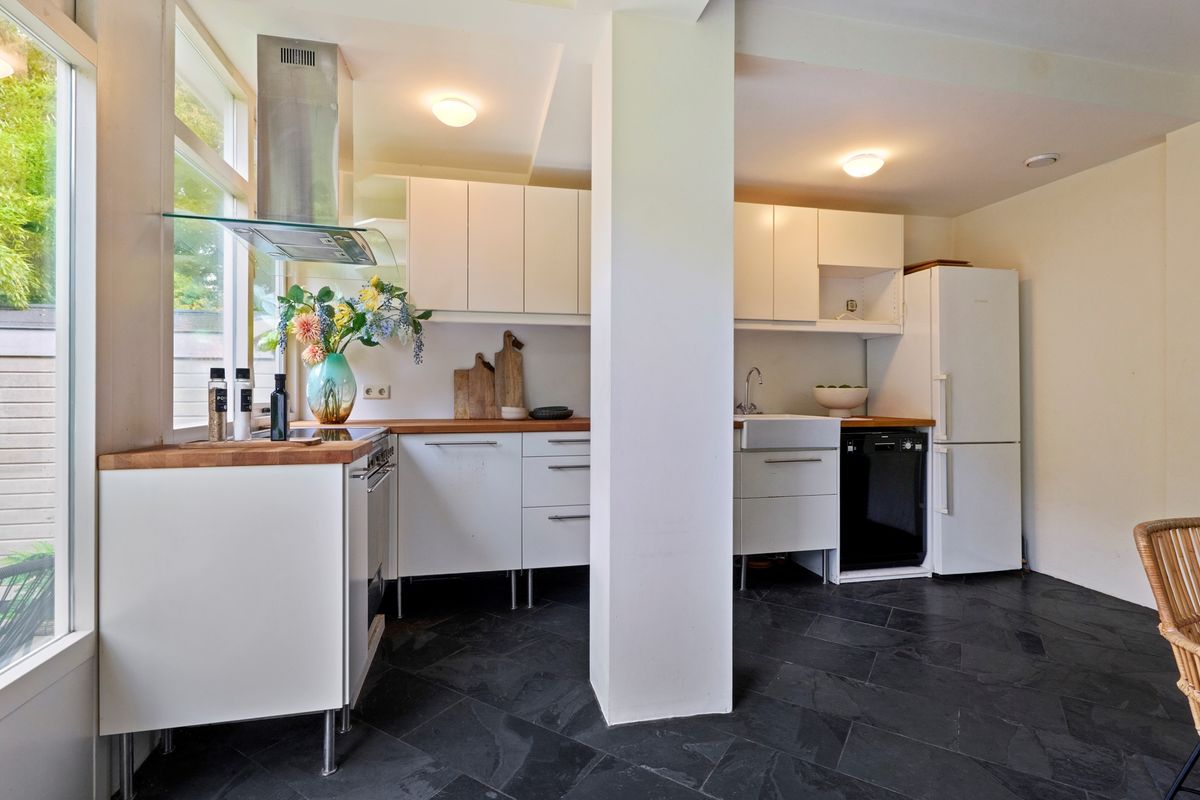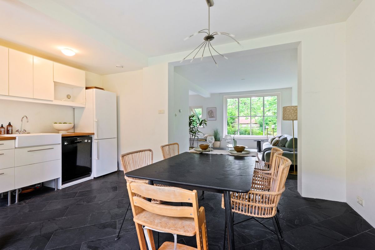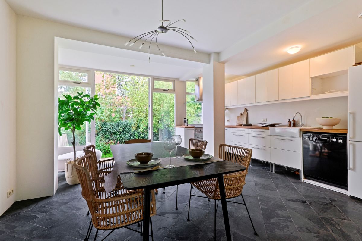The property features a charming front garden. Through the spacious entrance, you arrive in the hallway with a separate toilet (with washbasin). From the hallway, there is access to the bright living room, the cozy kitchen, and the staircase to the first floor. The L-shaped living room offers views of the front garden, while the kitchen overlooks the lush back garden with apple trees. Thanks to the mature greenery and trees, the garden offers plenty of privacy and a sheltered feel. Adjacent to the garden is a large storage space with direct access from the street.
