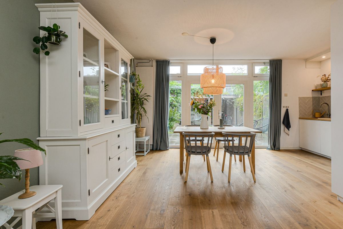 Ruime, lichte woonkamer (8,42 x 4,00/5,49 m.), met eiken vloer (2021), vaste trap-opbergkast en met open keuken. De tuin is via openslaande deuren te bereiken. De houten vloer ligt ook in de keuken en vanuit daar heeft u toegang tot de trapopgang naar de eerste verdieping.