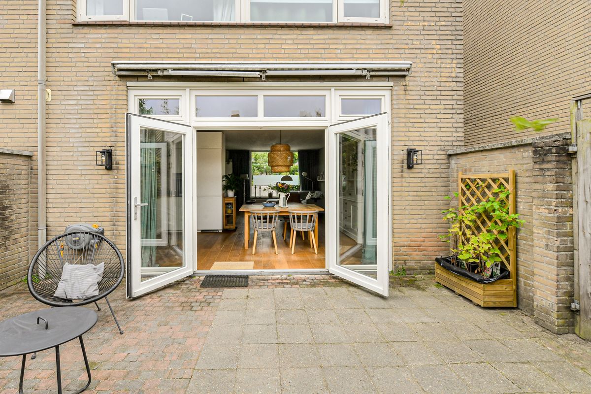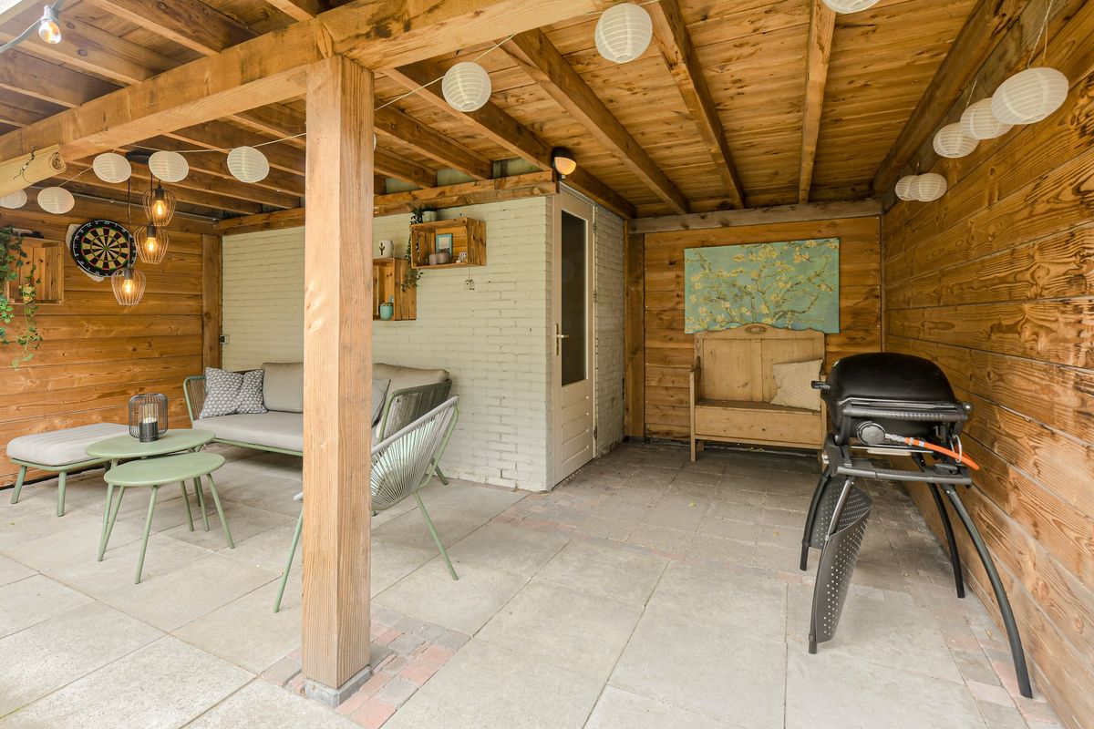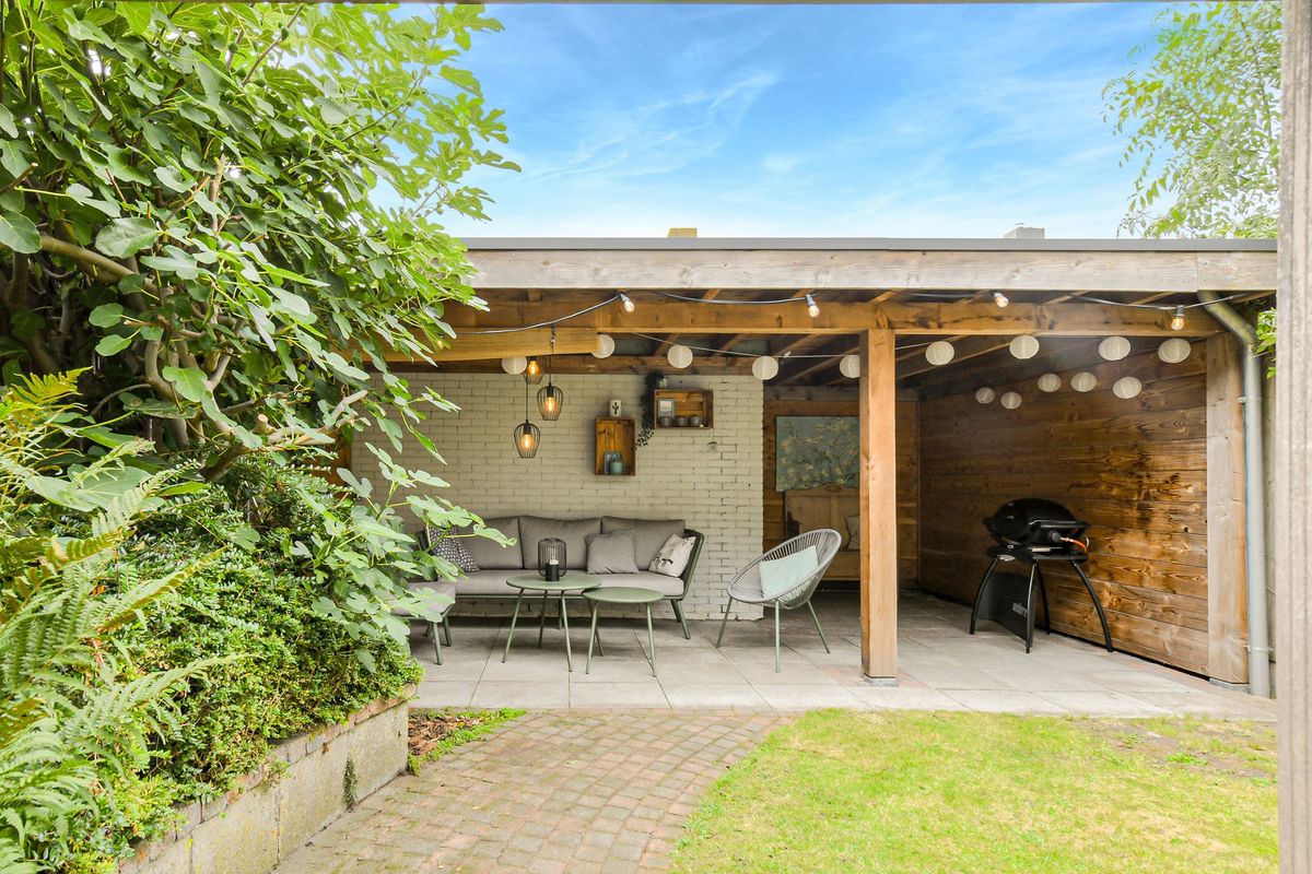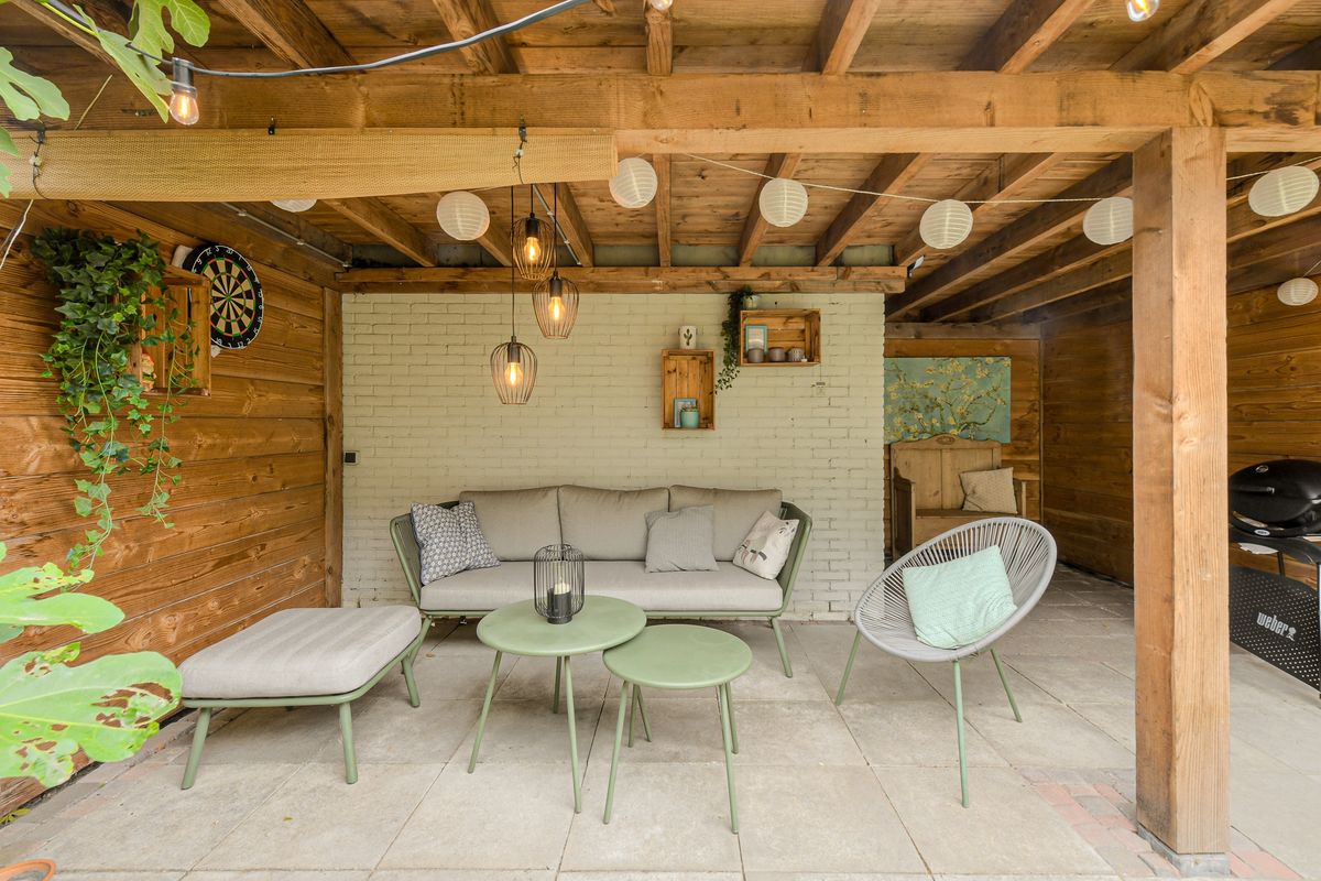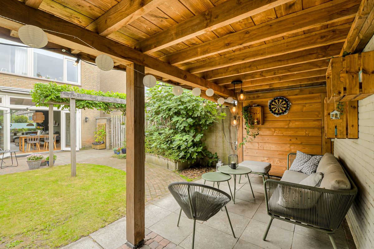 De achtertuin is gelegen op het noordwesten en is voorzien van een veranda (met elektra), borders, een gazon, terras, een pergola een waterpunt en lichtpunten. Tevens is de achtertuin voorzien van een eigen achterom.