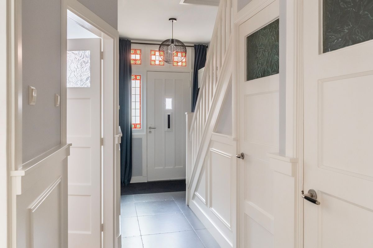 Entree via klassieke jaren '30 voordeur. Hal met glas-in-lood ramen afgewerkt in dubbelglas, ruime trapkast en modern toilet. De sfeervolle kamer en suite is absoluut een eyecatcher: schuifdeuren met geslepen glas, een natuurstenen schouw met pelletkachel, visgraat houten vloerdelen en openslaande deuren naar de tuin.