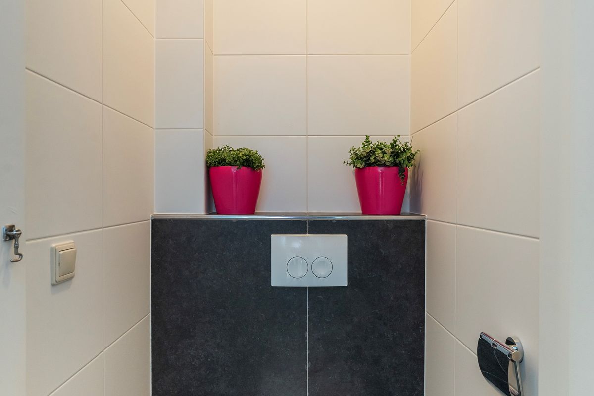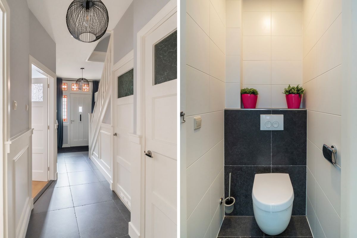 Tussenhal met wasruimte, CV-opstelling (2021) en toegang tot de eerste ruime badkamer, voorzien van hoekligbad, wastafelmeubel, tweede toilet en designradiator.