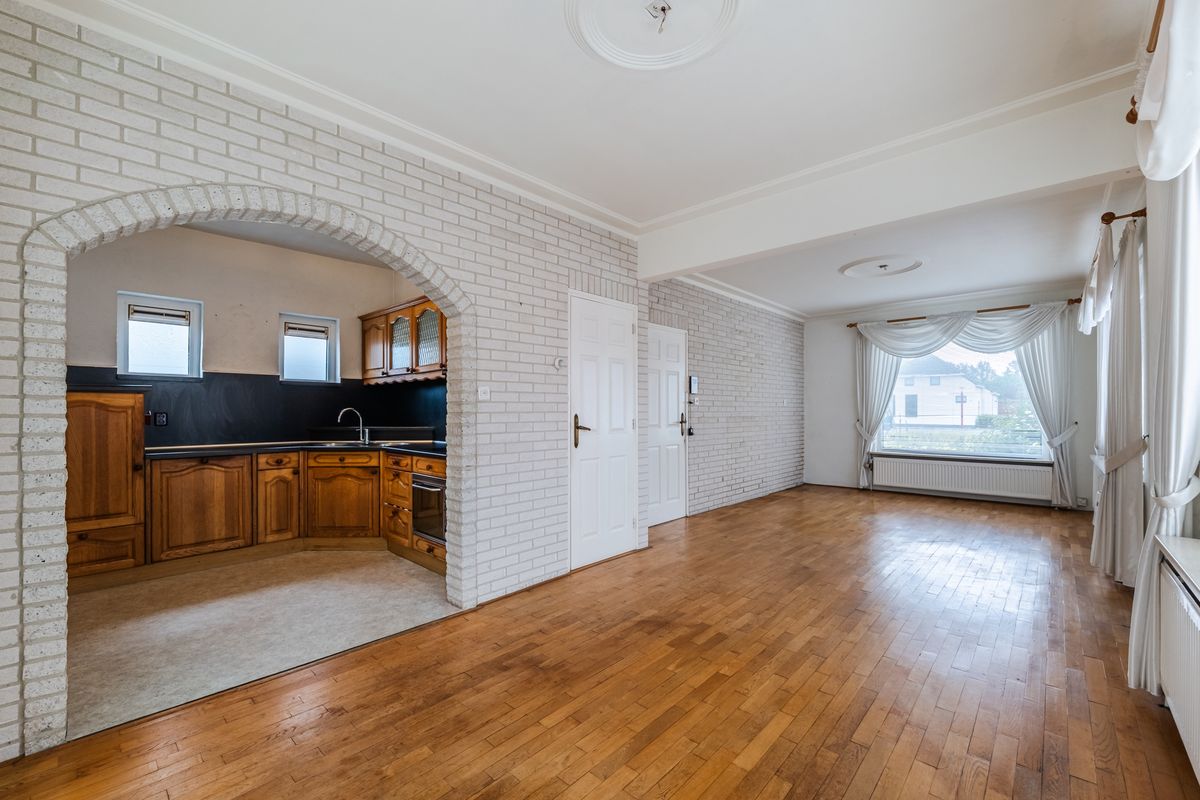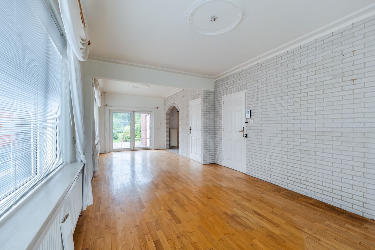 - Woonkamer met parketvloer en openslaande deuren naar de tuin