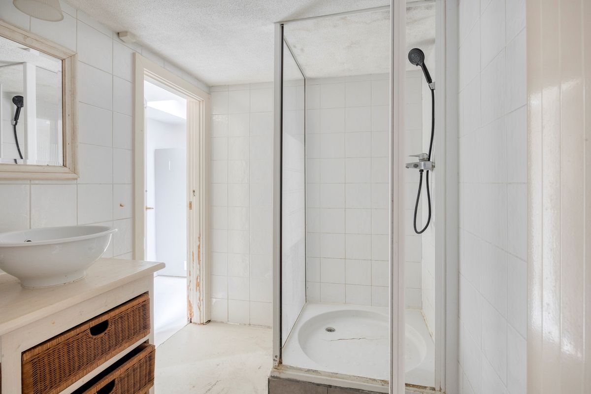 Direct naast de keuken ligt de badkamer, uitgerust met een douchecabine en een wastafelmeubel.