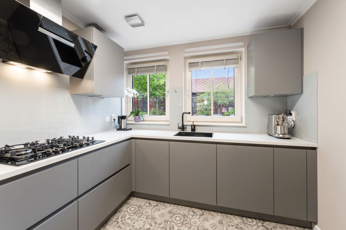 Entree met hal, meterkast en modern toilet, bidet en warm water. De royale woonkamer, voorzien van trapkast, is tijdens de bouw al 2,5 meter uitgebouwd. Openslaande deuren geven toegang tot de diepe en verzorgde achtertuin, waar je de hele dag door van de zon kunt genieten. Aan de voorzijde bevindt zich de moderne open keuken (2020) met inbouwapparatuur zoals een 5-pits gaskookplaat, vaatwasser en oven en tegelvloer afwerking. De woonkamer is afgewerkt met een sfeervolle eikenhouten vloer en de entree en toilet van een tegelvloer met vloerverwarming.