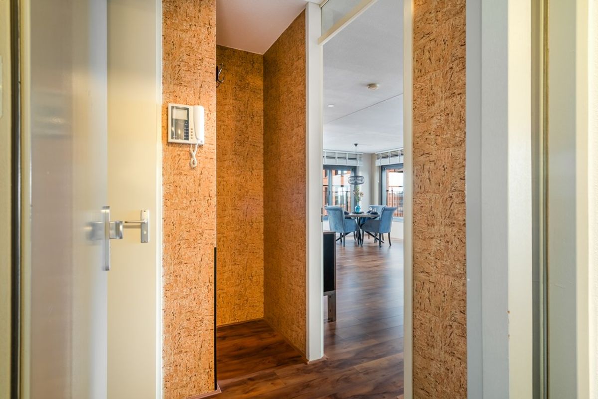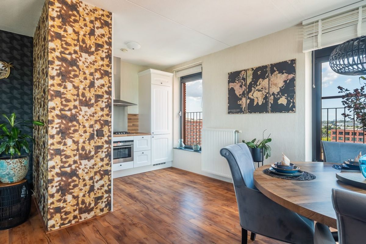 Via de centrale entree en de liftinstallatie bereik je moeiteloos de achtste verdieping. De entree van het appartement komt uit op een lichte hal en leidt je direct naar de sfeervolle woonkamer, waar de grote raampartijen onmiddellijk de aandacht trekken. Het uitzicht is werkelijk indrukwekkend – vanaf deze hoogte kijk je vrij weg over de wijde omgeving van Leidschenveen, met een gevoel van ruimte en rust.
