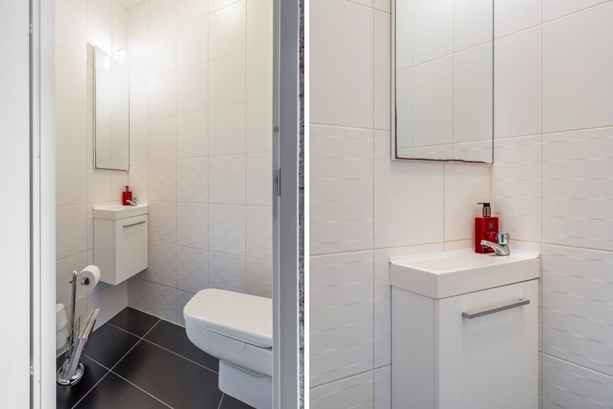 De badkamer is volledig betegeld en verzorgd afgewerkt. Deze beschikt over een ruime douchecabine, een dubbele wastafel met bijbehorend meubel, meerdere badkamerkasten, een handdoekradiator en elektrische voerverwarming. Daarnaast is er in de hal een separate, volledig betegelde toiletruimte aanwezig. Ook bijzonder praktisch is de ruime inpandige wasruimte met aansluitingen voor wasmachine en droger én voldoende opbergruimte voor bijvoorbeeld voorraad of schoonmaakspullen.