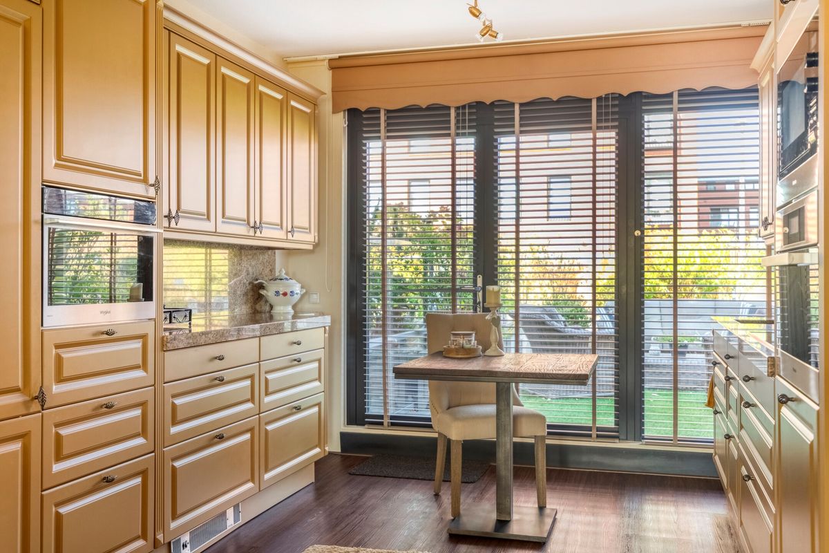 De keuken is uitgevoerd in hoogwaardig hout met een granieten werkblad, voorzien van degelijke Miele-inbouwapparatuur. Alle kasten zijn uitgerust met laden voor optimaal gebruiksgemak. Via de openslaande deuren loopt u zo het terras op. Dankzij de slimme kickspace-verwarming in de plint is het hier zelfs in de winter behaaglijk.