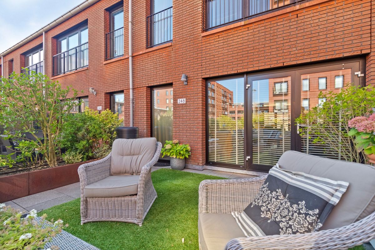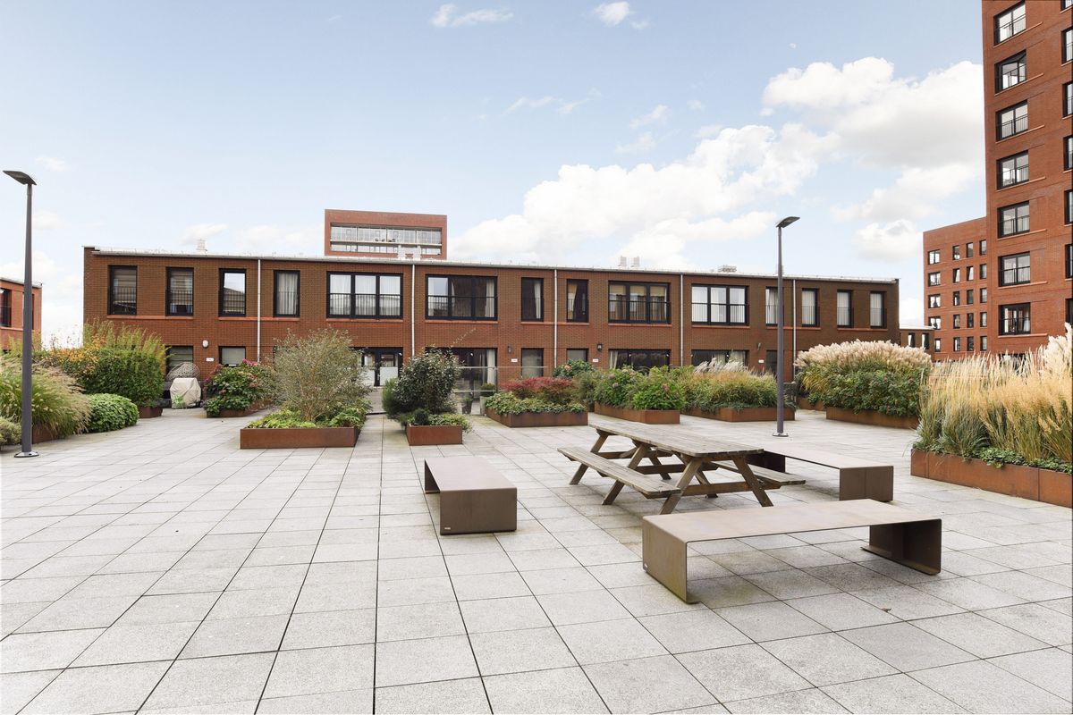 Het terras ligt perfect op het zuidwesten, waardoor u tot laat in de avond geniet van zon en privacy. Een ideale plek voor een glas wijn of een ontspannen diner buiten met uitzicht op de groene daktuin.