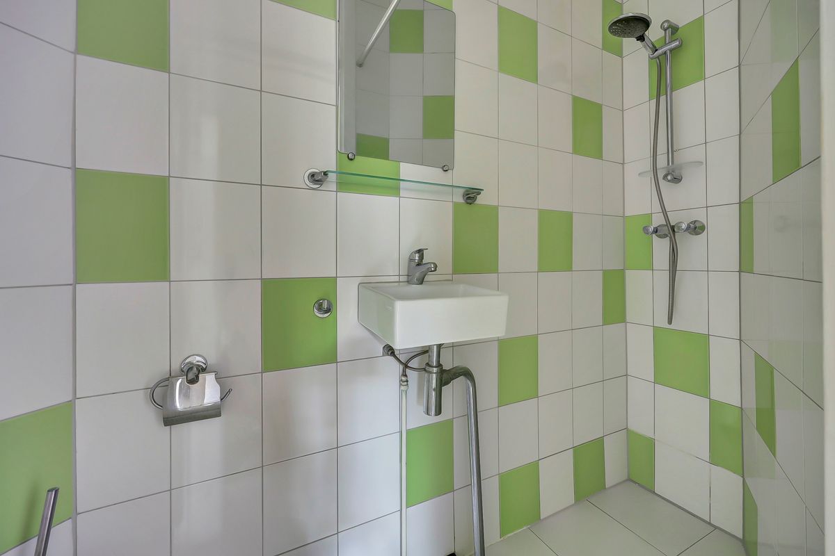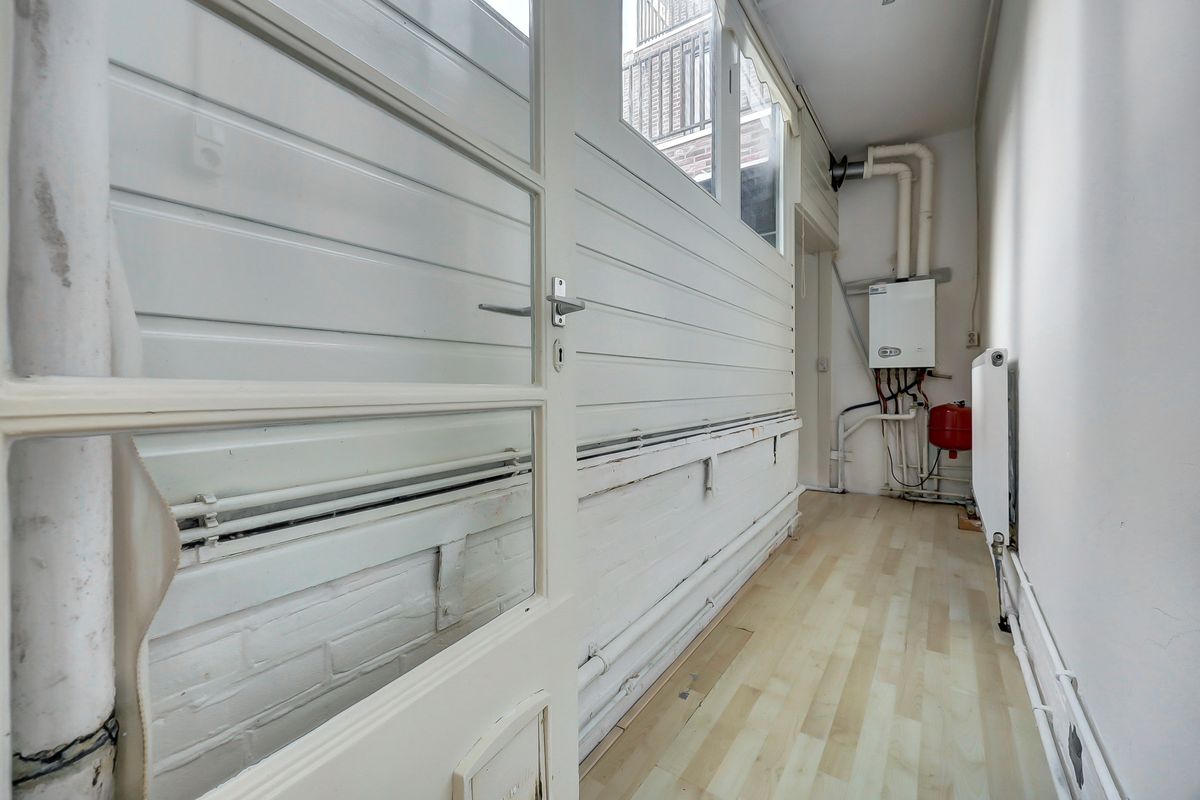 Achter de woning zat een tuintje maar is verbouwd tot grote wasruimte.