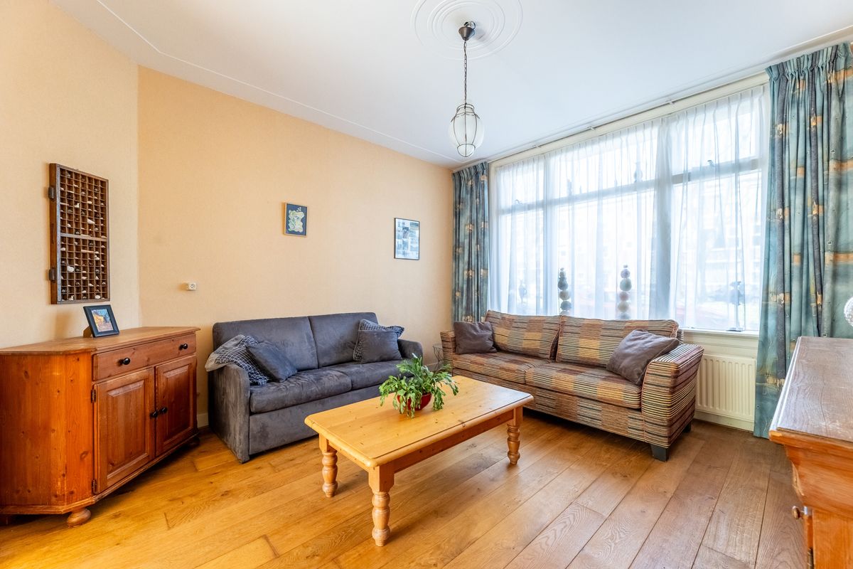 Overloop met de trapopgang naar de tweede verdieping, een toiletruimte met fonteintje en een kamer aan de voorzijde. De zeer royale woonkamer heeft hoge plafonds, veel lichtinval en een gezellige erker. De vloer is mooi afgewerkt met een eiken parketvloer.