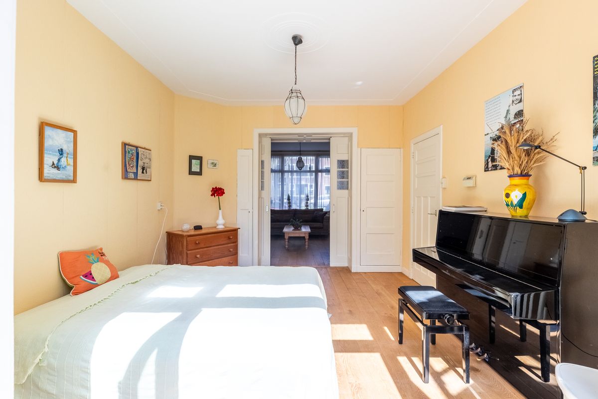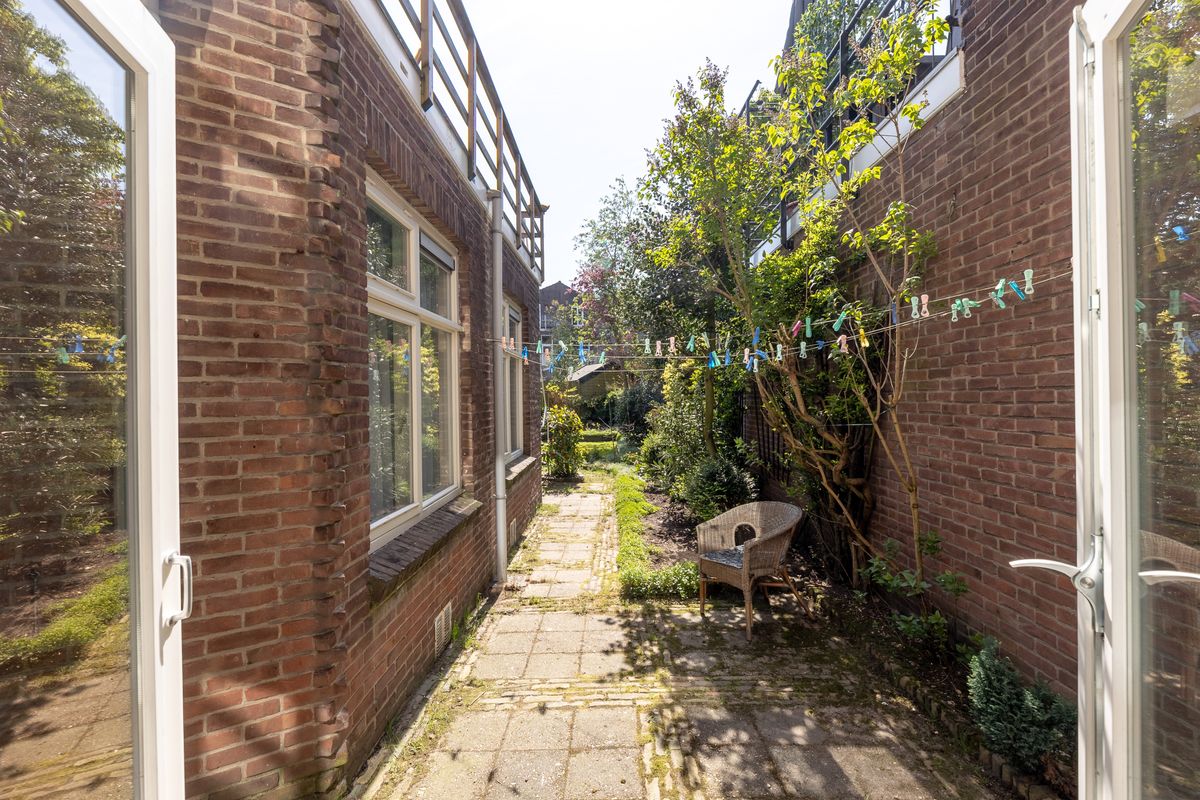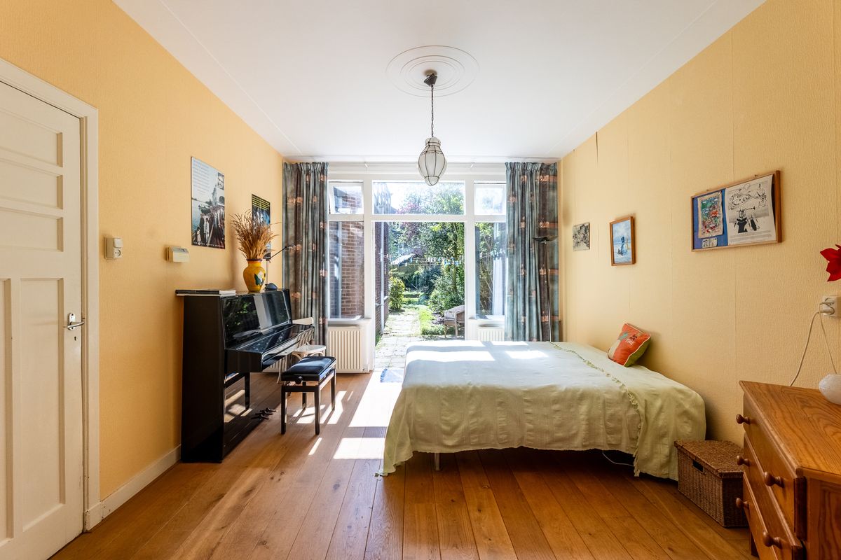 Entree met de lange hal. Op de begane grond is al direct de fraaie en zo kenmerkende jaren ‘30 indeling terug te vinden. Er zijn twee kamers die middels de en-suitedeuren met vaste kastruimte apart van elkaar te gebruiken zijn. De kamer aan de achterzijde heeft openslaande deuren naar de achtertuin. In de hal is er een toiletruimte en de trapopgang naar de verdieping. In het verlengde van de hal is een (voormalige) keukenruimte met c.v.-installatie en aansluitend een badkamer met ligbad, douche en wastafelmeubel. Vanuit de badkamer loopt u door naar een extra (slaap)kamer.