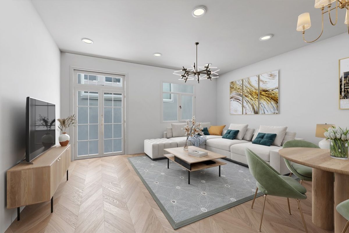 Through the well-maintained stairwell with elevator you reach the second floor. The entrance leads to the hallway with access to the kitchen and bathroom. The bright living space offers room for a sitting area, dining area and sleeping area. Large windows and French doors to the fire escape allow plenty of natural light and create a pleasant connection with the outdoors.