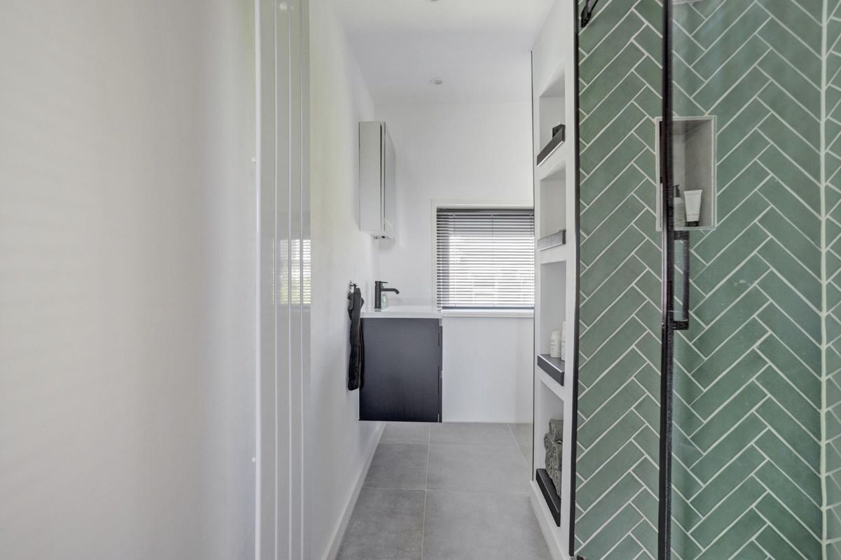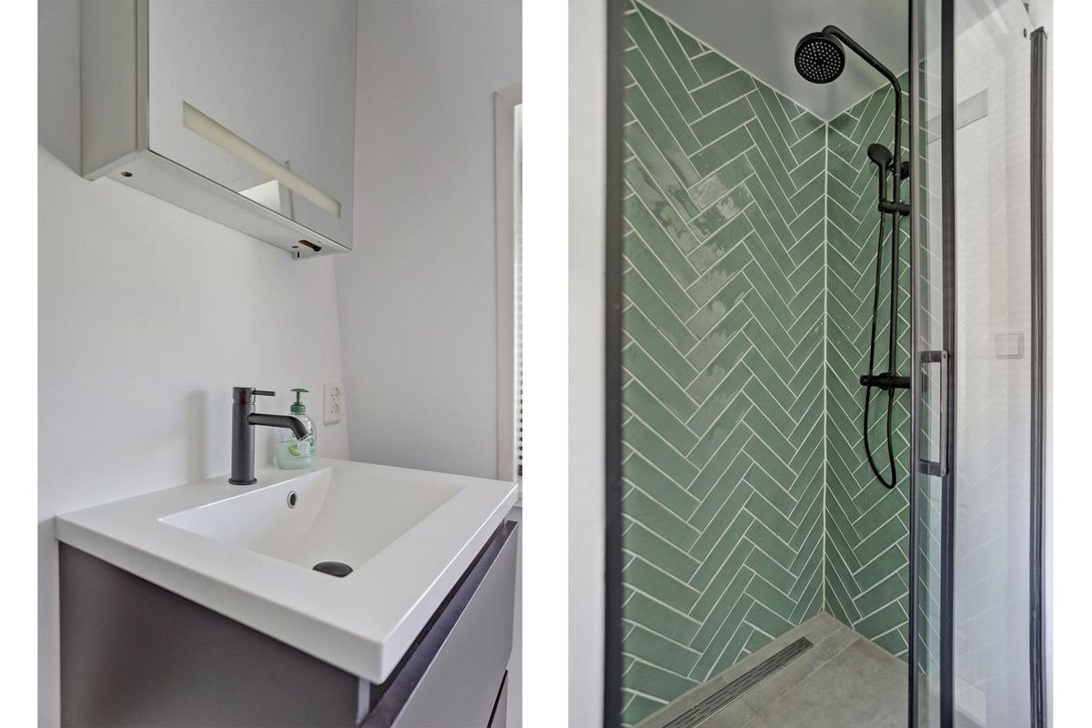De moderne badkamer is stijlvol en praktisch met een inloopdouche voorzien van zwarte glazen douchewand, een wastafelmeubel met spiegelverlichting en zelfs een urinoir.