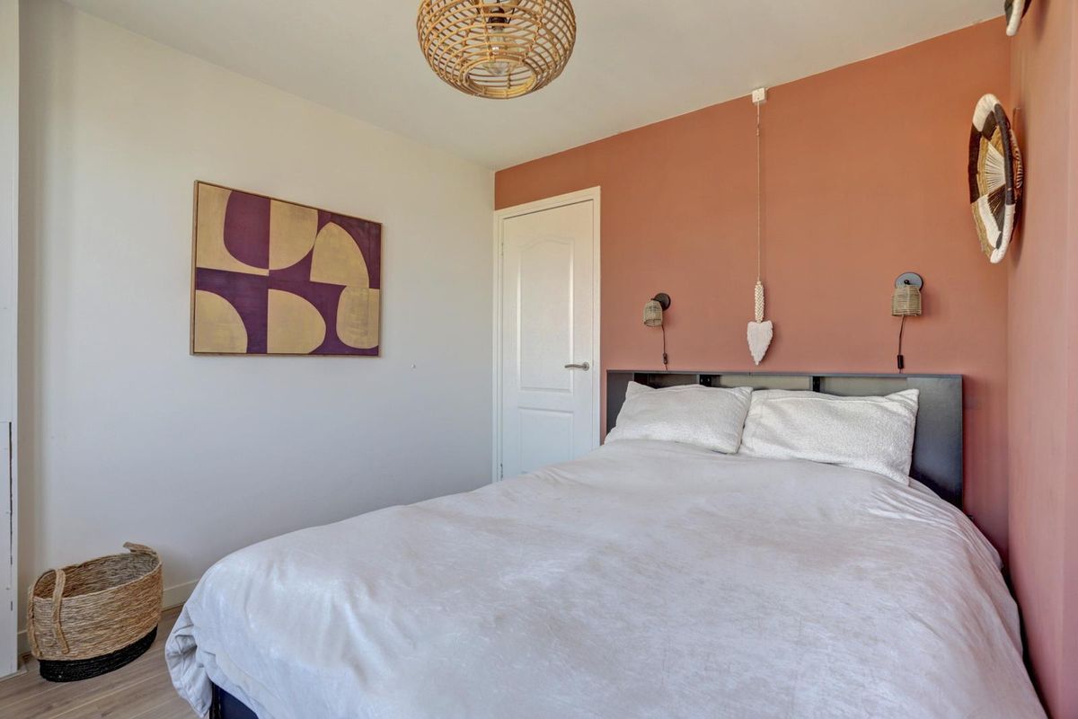 Slaapkamer 1 ligt aan de voorzijde en is strak afgewerkt met glad stucwerk en laminaat.