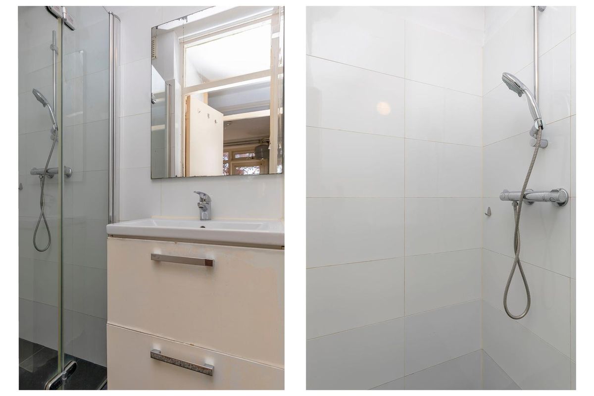 * De volledig betegelde badkamer is voorzien van een douchecabine en wastafelmeubel.