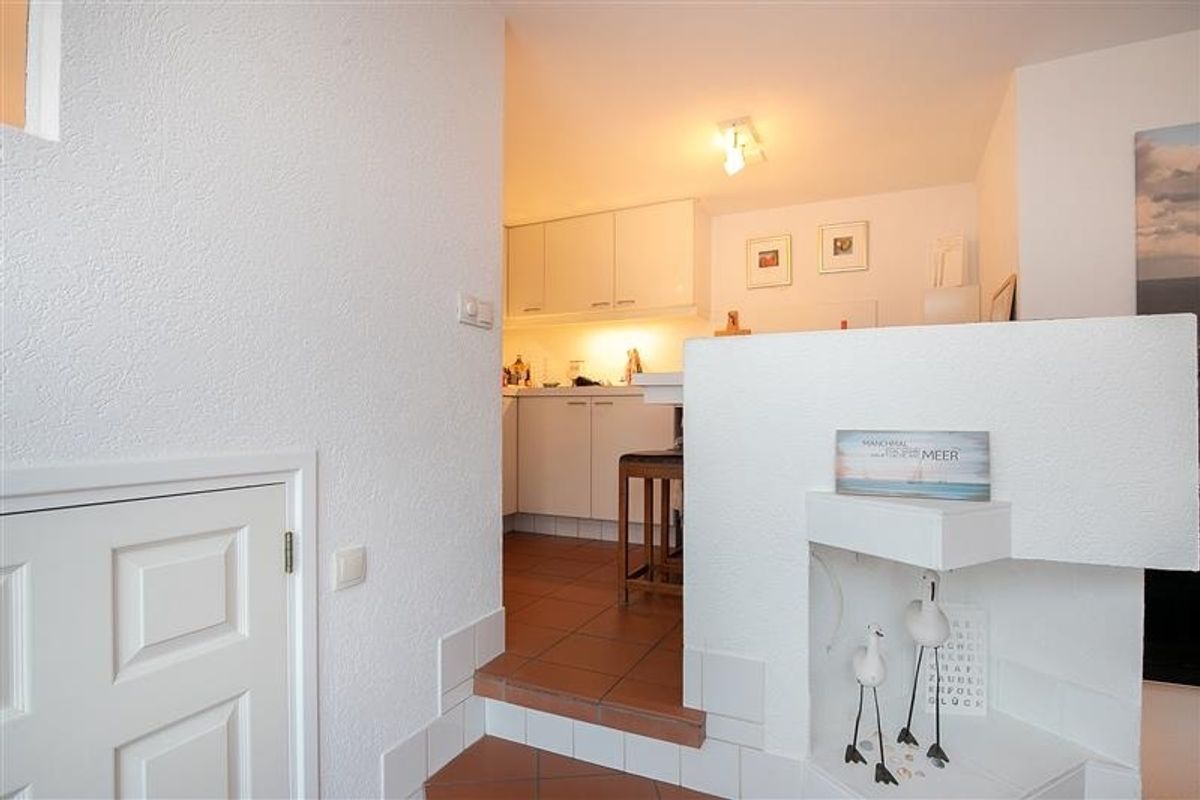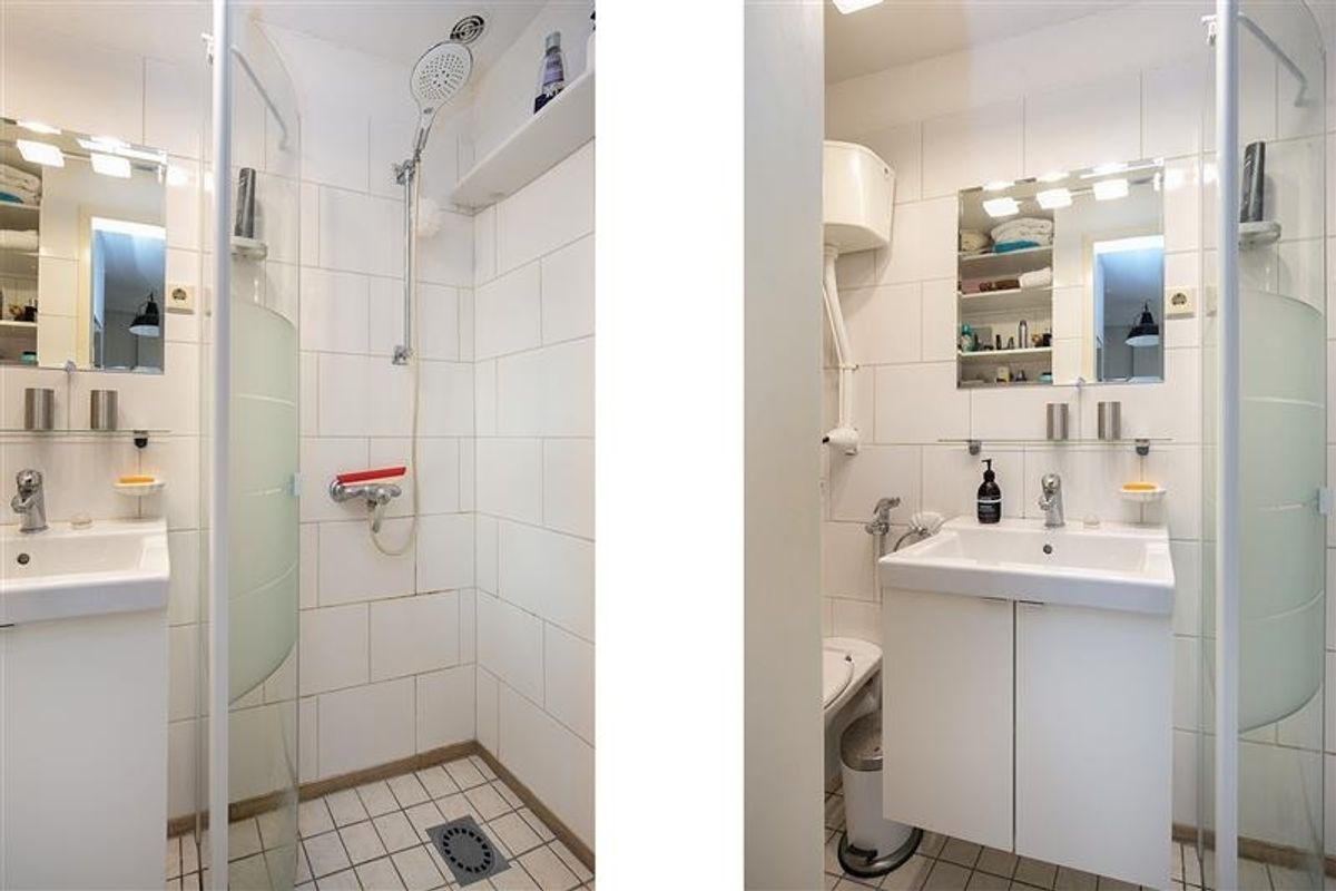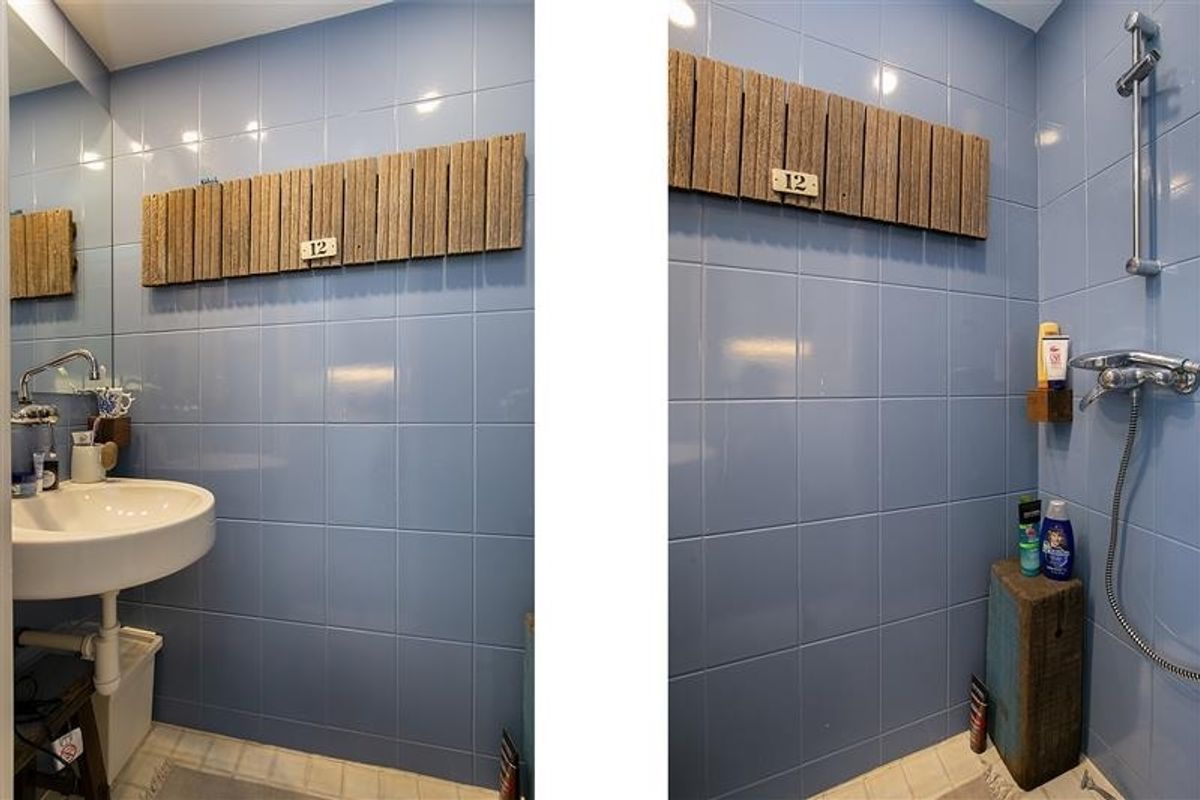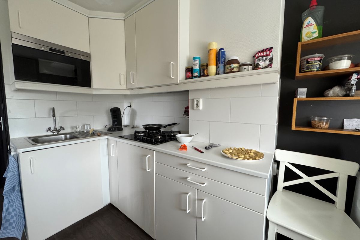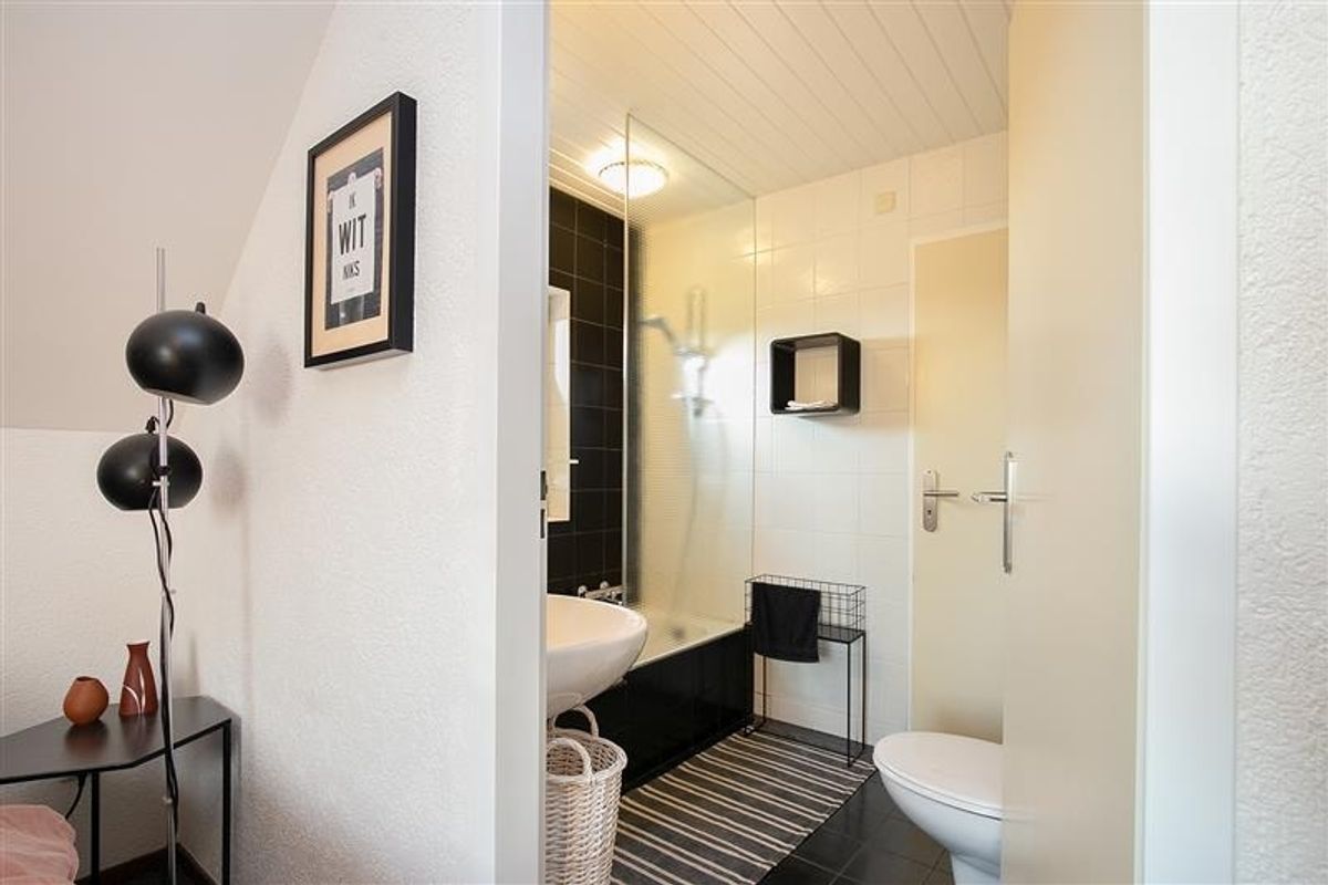 Compact maar stijlvol, met wit keukenblok, moderne vloer en uitzicht over de polders. Badkamer met douche, wastafel en zwevend toilet.